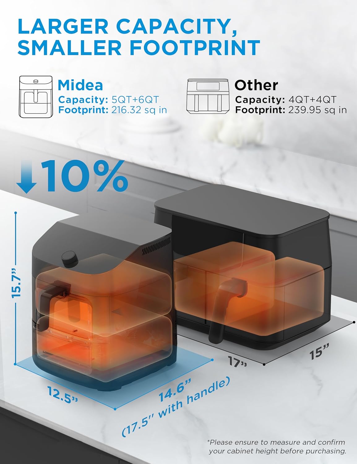 Dual Basket Air Fryer Oven 11 Quart 8 in 1 Functions, Clear Window, Smart Sync Finish, Works with Alexa, Wi-Fi Connectivity, 50+ App Recipes for family meals, Bake, Roast, Grill, Broil, Toast