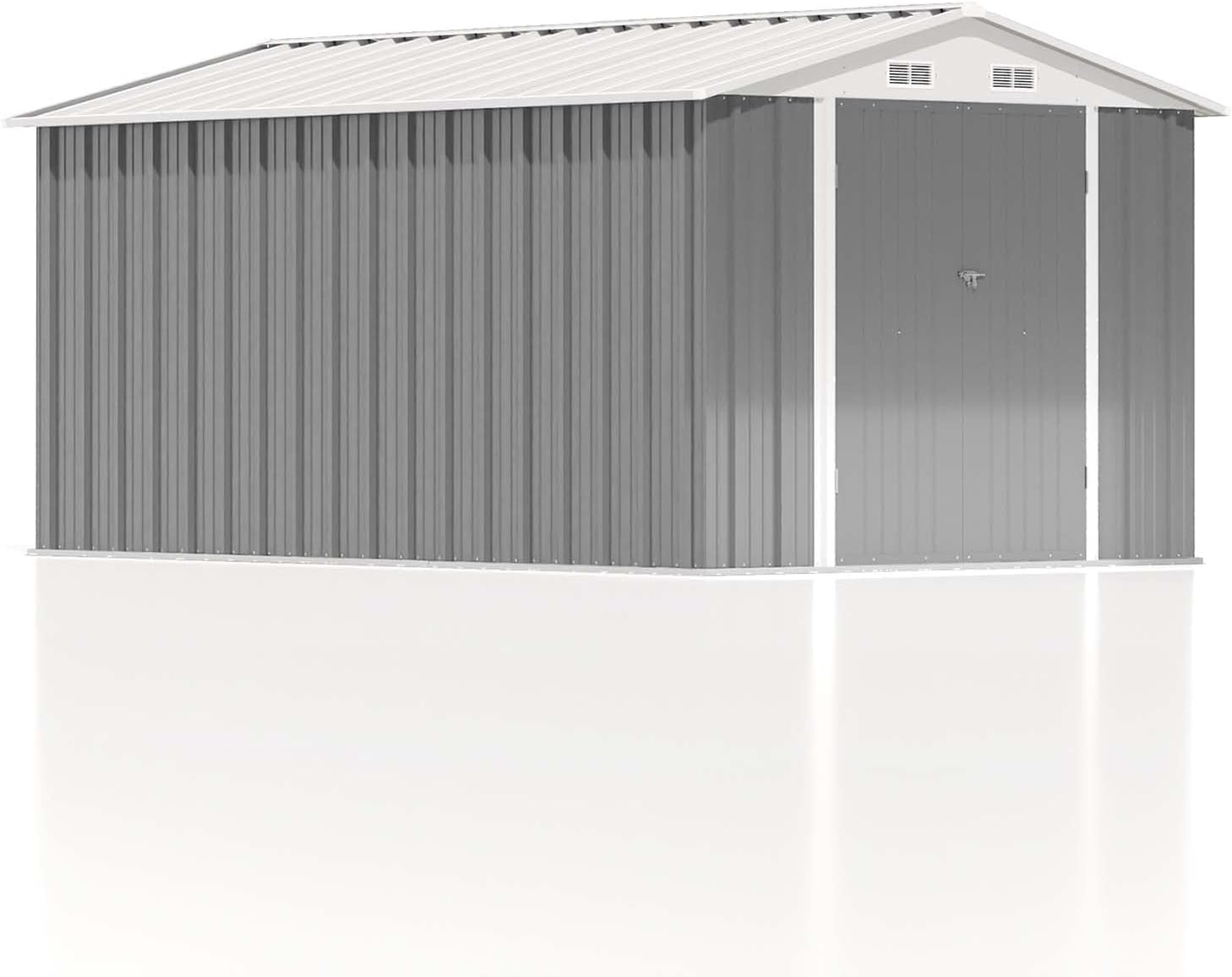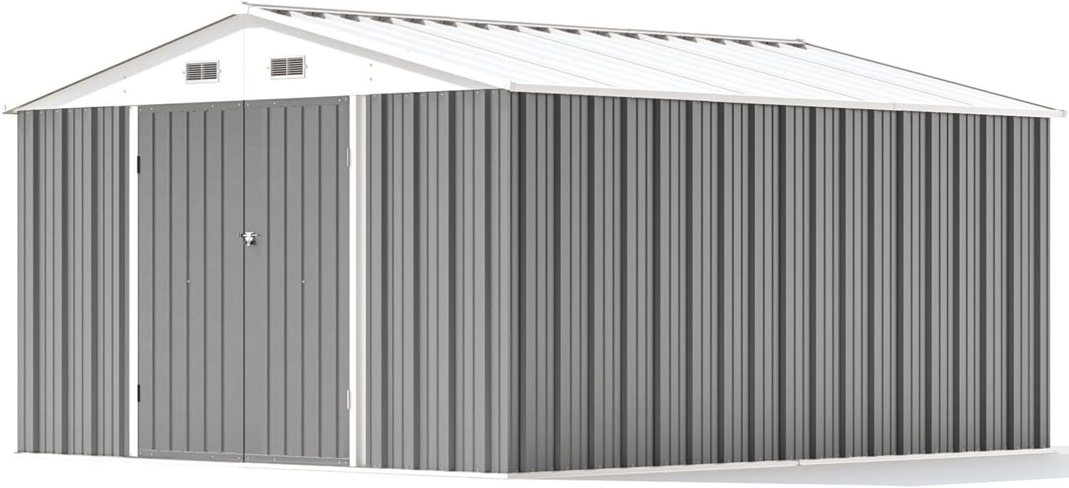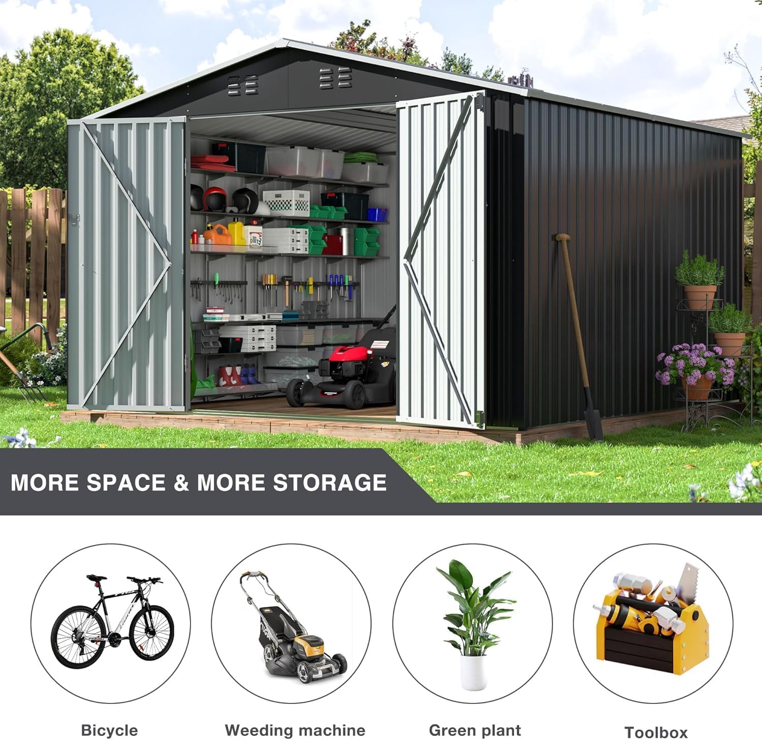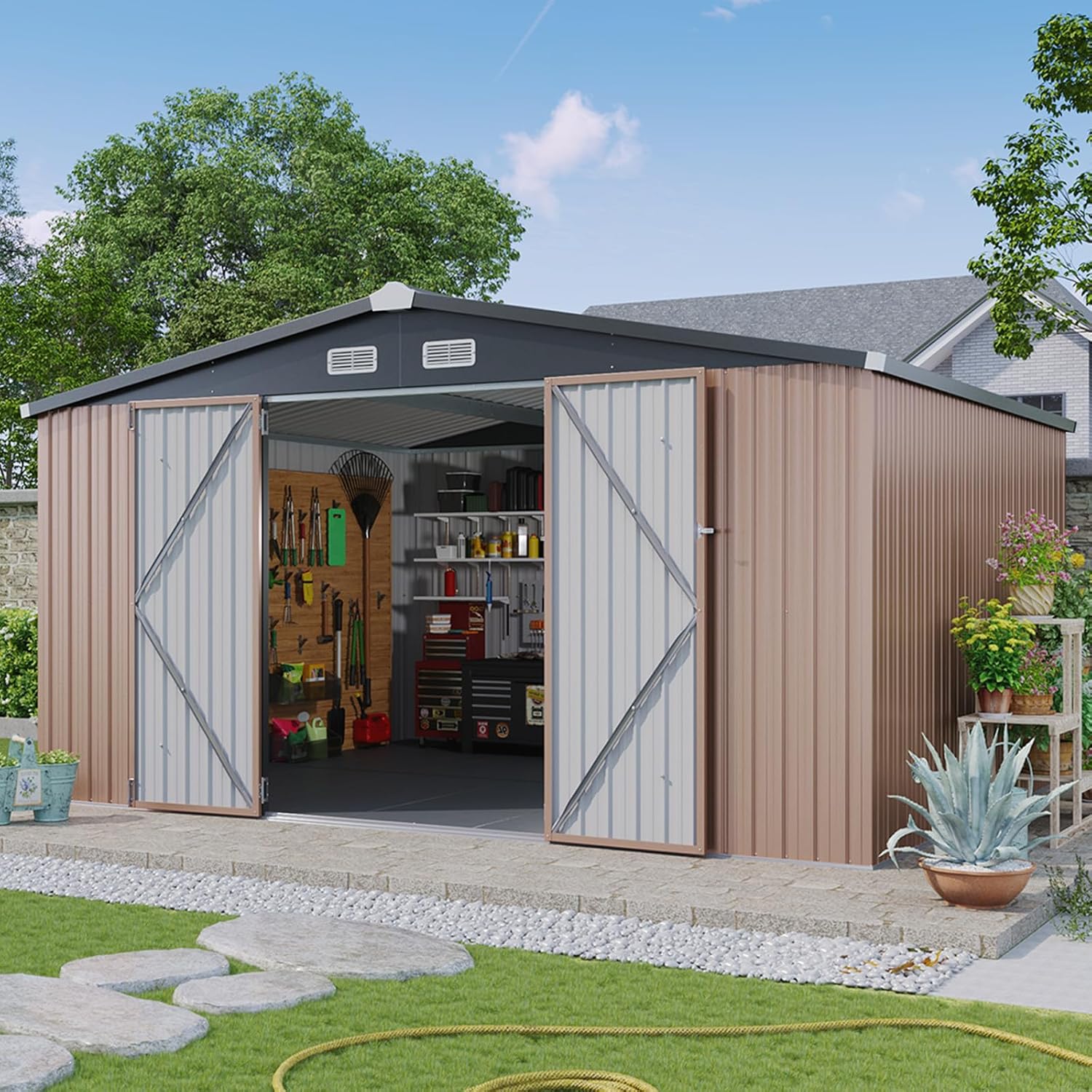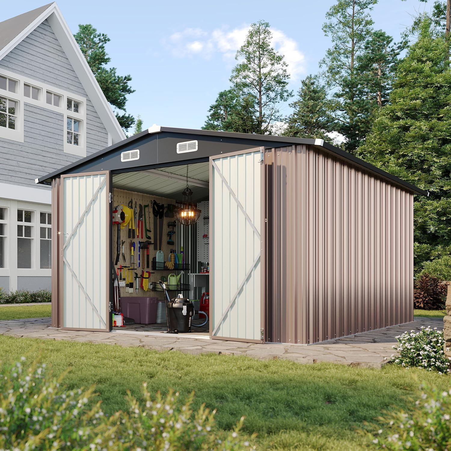 Aoxun 12x10 FT Shed Metal Outdoor Waterproof Storage Shed Steel Utility Garden Tool Shed with Door & Lock Outdoor Storage for Garden Patio Lawn Poolside, Brown