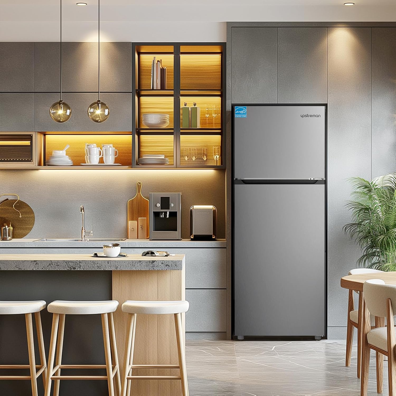 Upstreman 7.7 Cu.Ft. Refrigerator with Freezer, Double Door, Adjustable Thermostat, Large Capacity, Reversible Door Swing, Refrigerator for Apartment, Office, Dorm, Stainless (BD75)