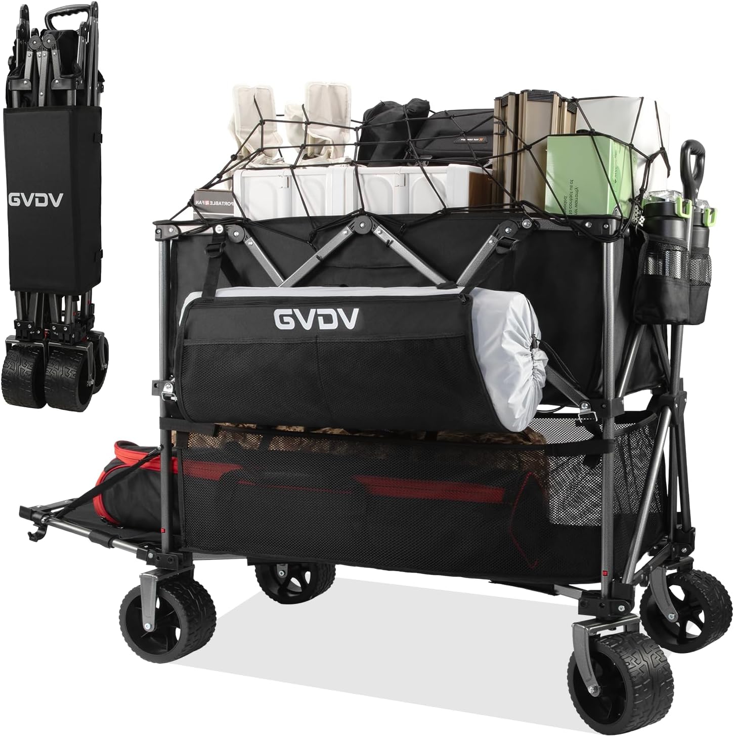 Double-decker cart, 500 lb capacity, 400 liter foldable cart, all-terrain wheels, 46" extra-long extension cart, foldable cart