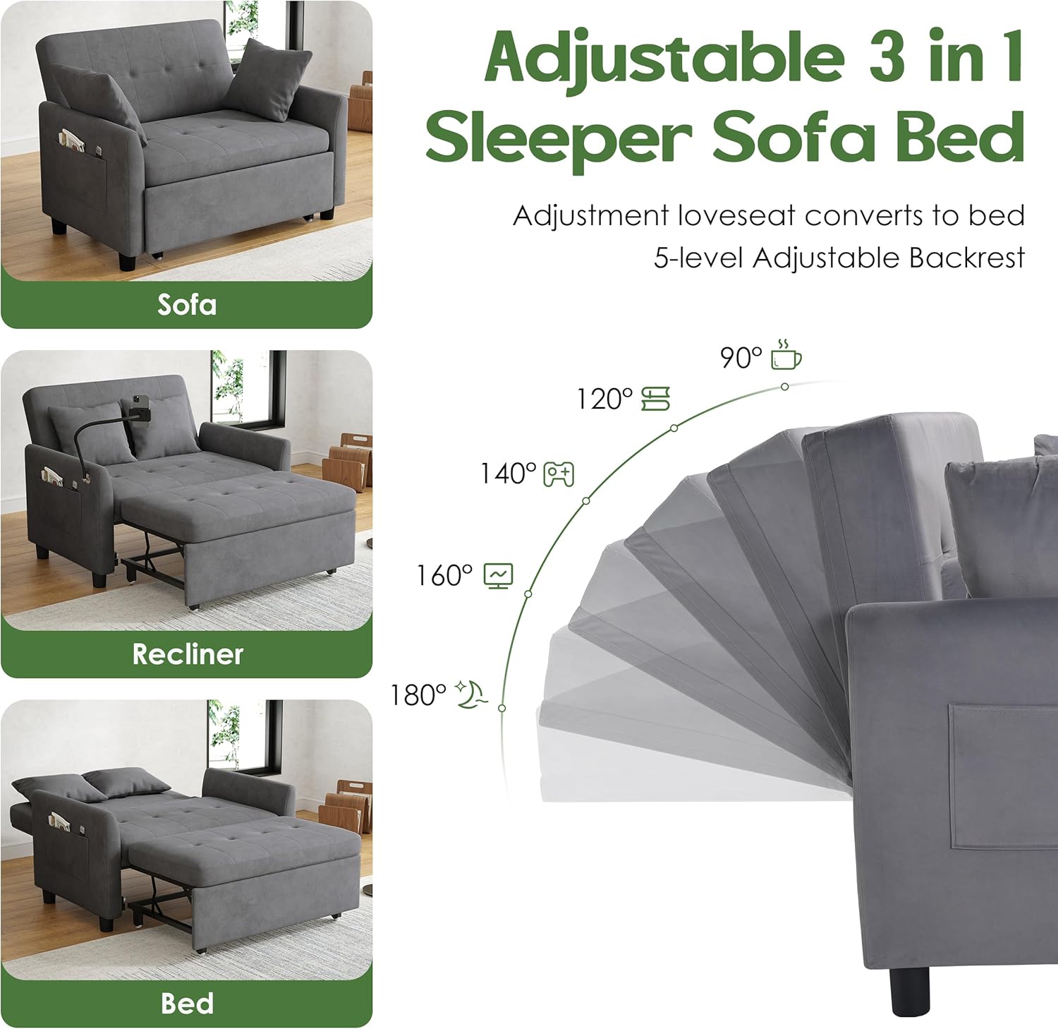 Sleeper Sofa Bed, 3 in 1 Convertible Sleeper Couch Bed Pull Out, Small Loveseat Sofa, Futon Sofa Bed Full Size, 46" Velvet Love Seat