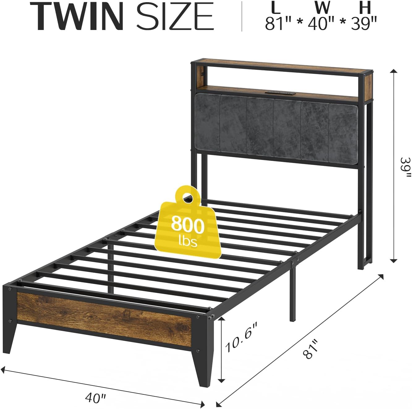 OLEVS Single Bed Frame with LED Light Storage Headboard and Type C Charging Station Metal Platform Bed Single Size No Box Spring Required