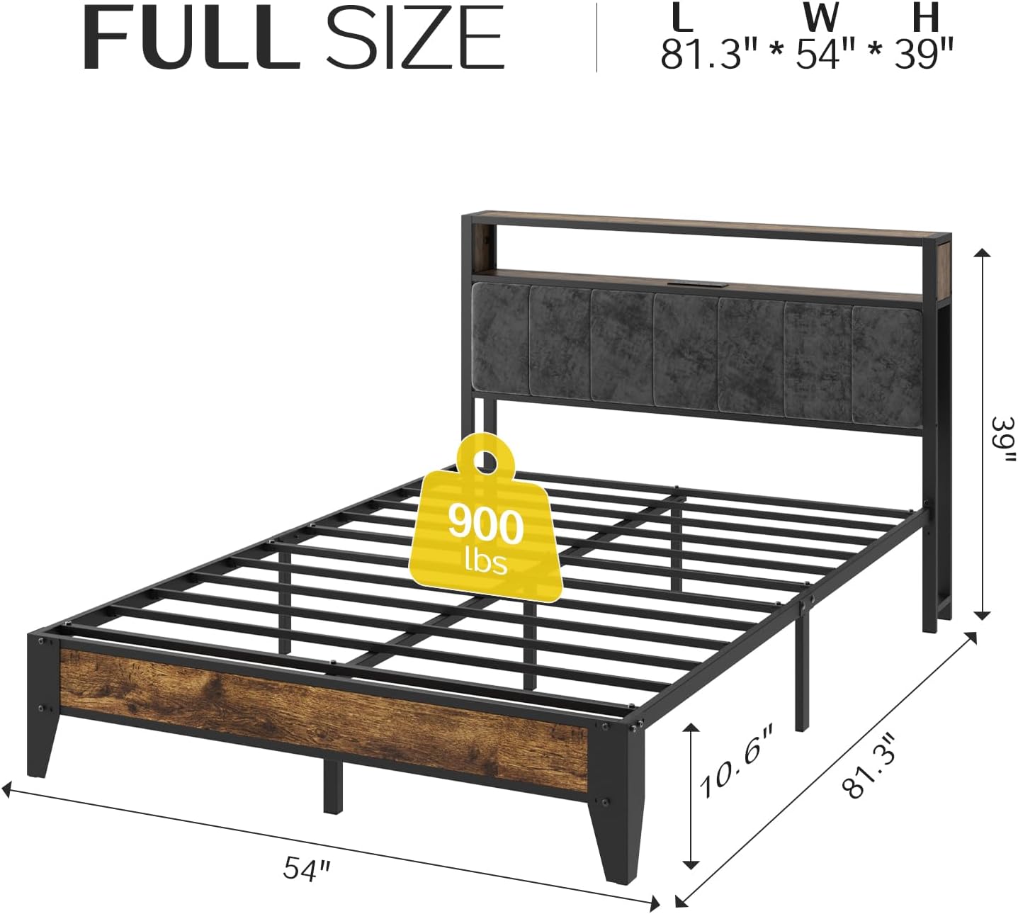 Queen Size Bed Frame with 2-Tier Storage Shelves Headboard, Platform Bed with Charging Station, LED Lights No Box Spring Needed Noise Free