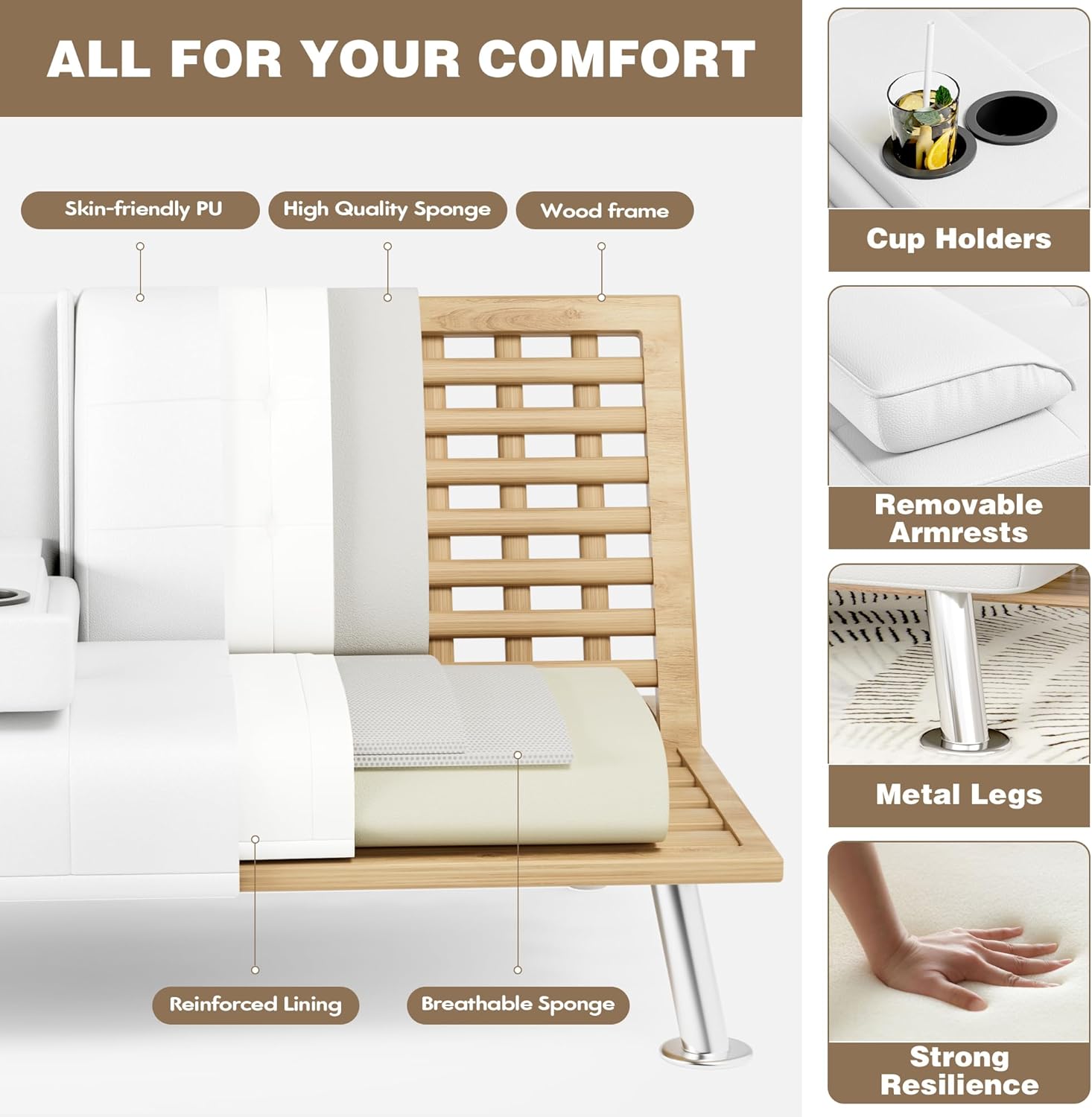 Homall Futon Sofa Bed, Leather Futon Couch with Removable Armrests, Adjustable Recliner Sleeper Sofa Bed with Dual Cup Holders for Living Room, Apartment