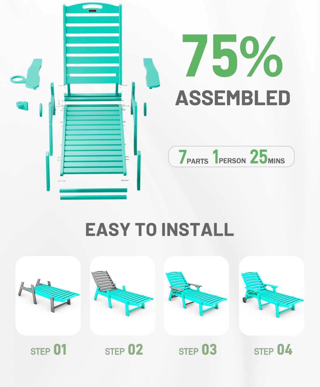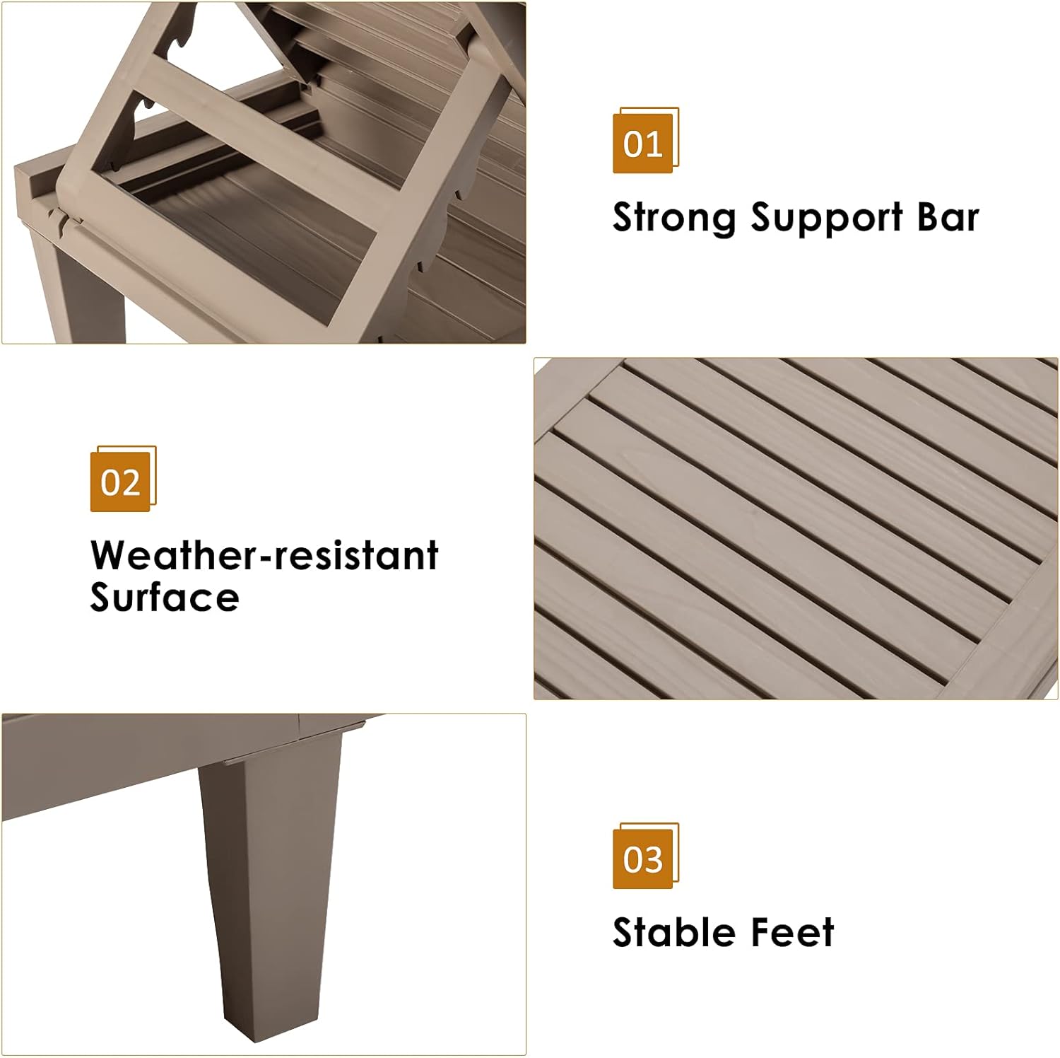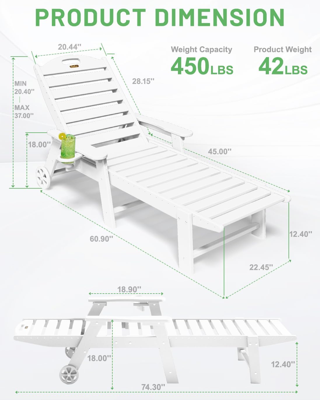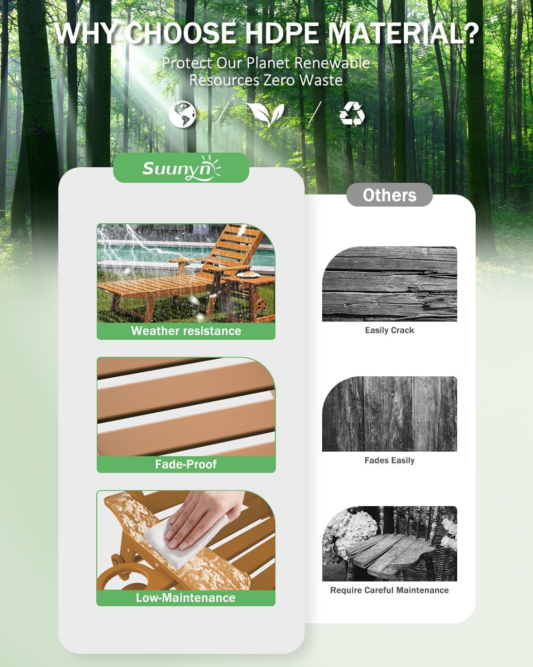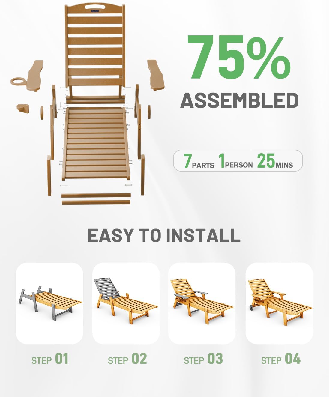 Lounge Chair Outdoor, Chaise Lounge, HDPE 6-Position Outdoor Chaise Lounge, Patio Lounge Chair with Wheels & Cup Holder for Pool Poolside Deck Backyard, Teak