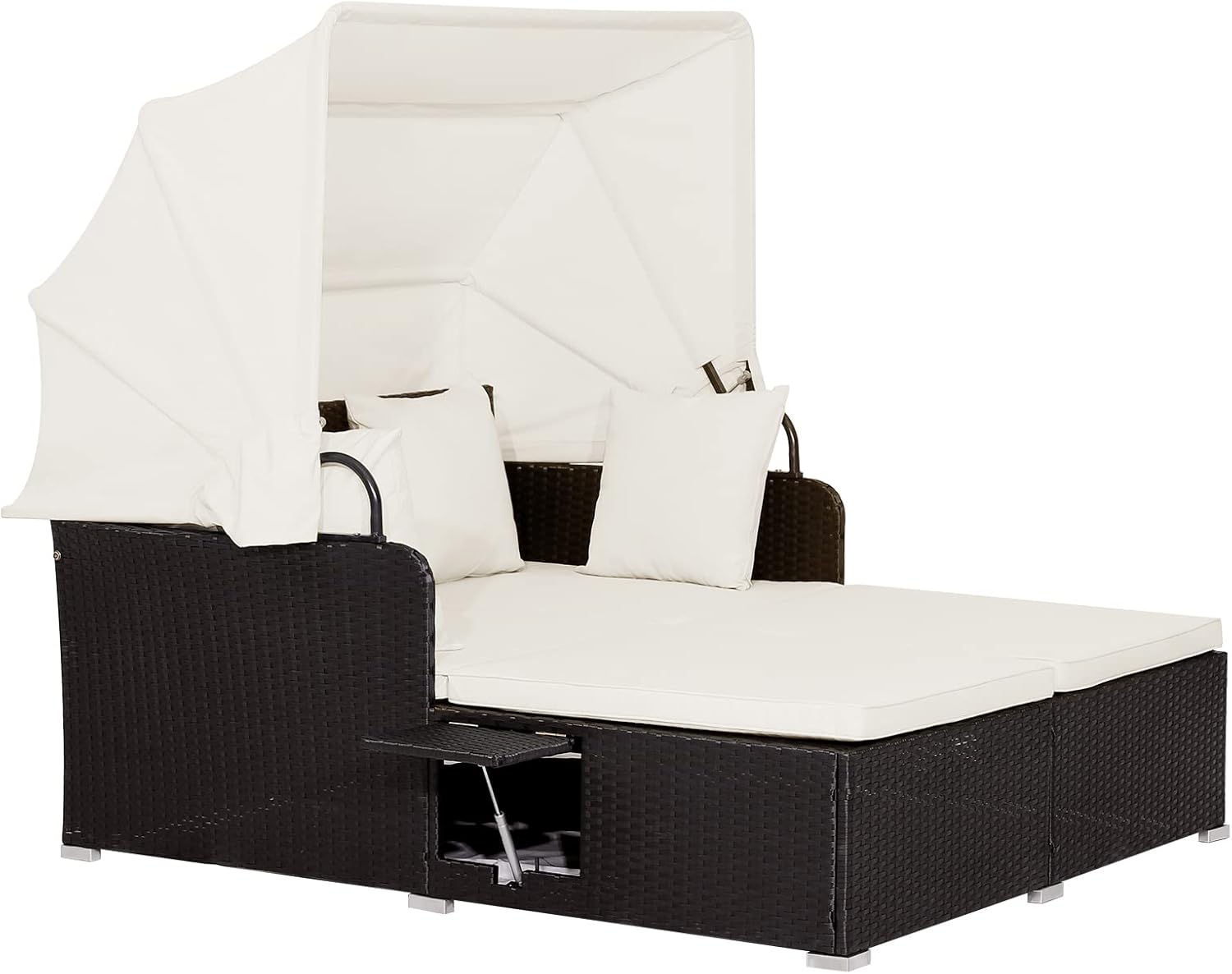 RELAX4LIFE Patio Outdoor Daybed with Canopy, Wicker Sunbed w/Cushions, 4 Pillows & 2 Retractable Side Trays, 2-Person Lounge Bed Conversation for Poolside Porch Garden, Rattan Outdoor Bed (Turquoise)