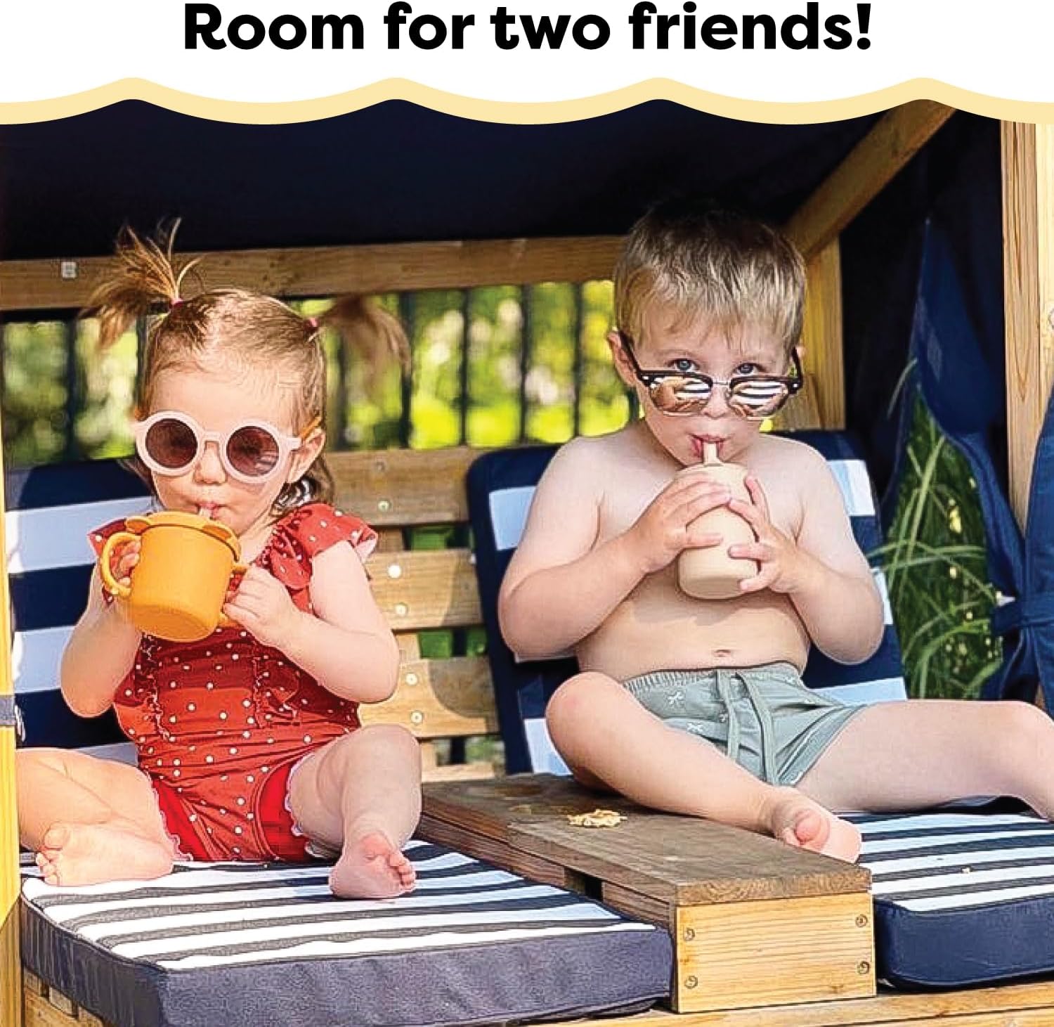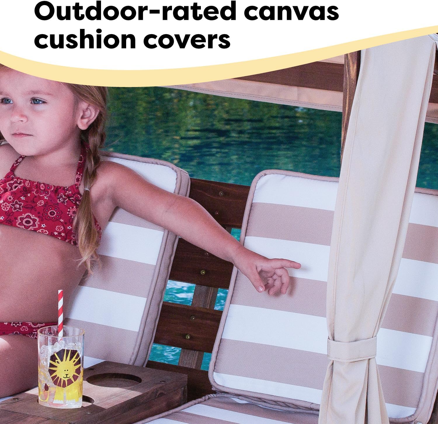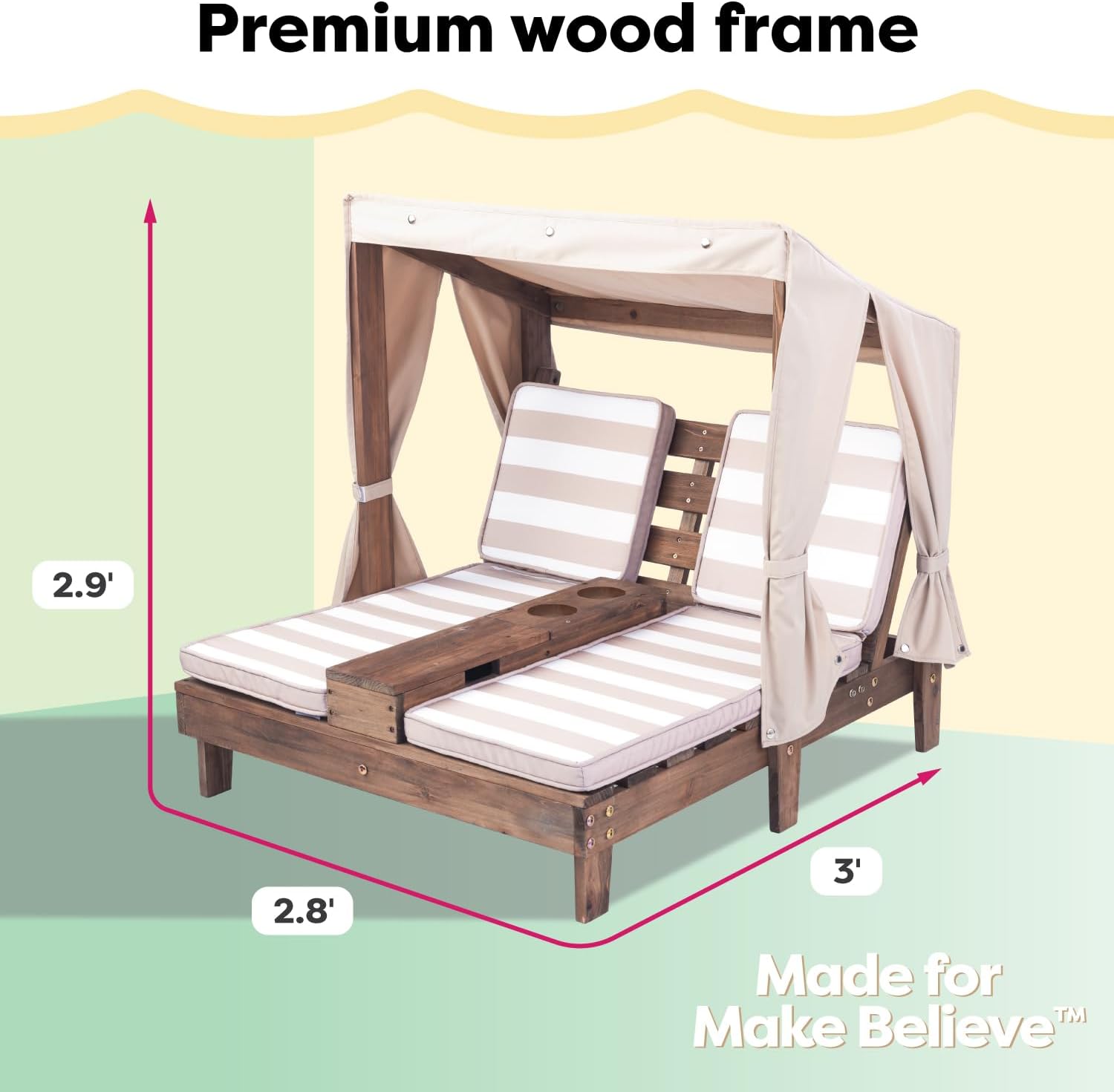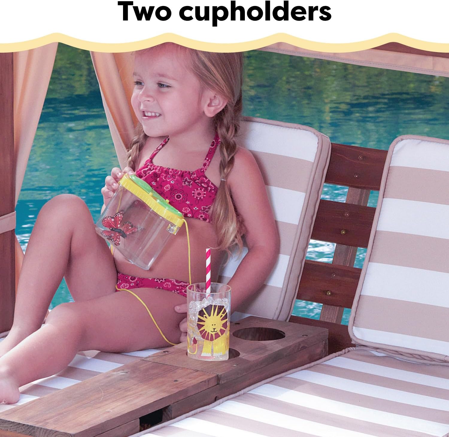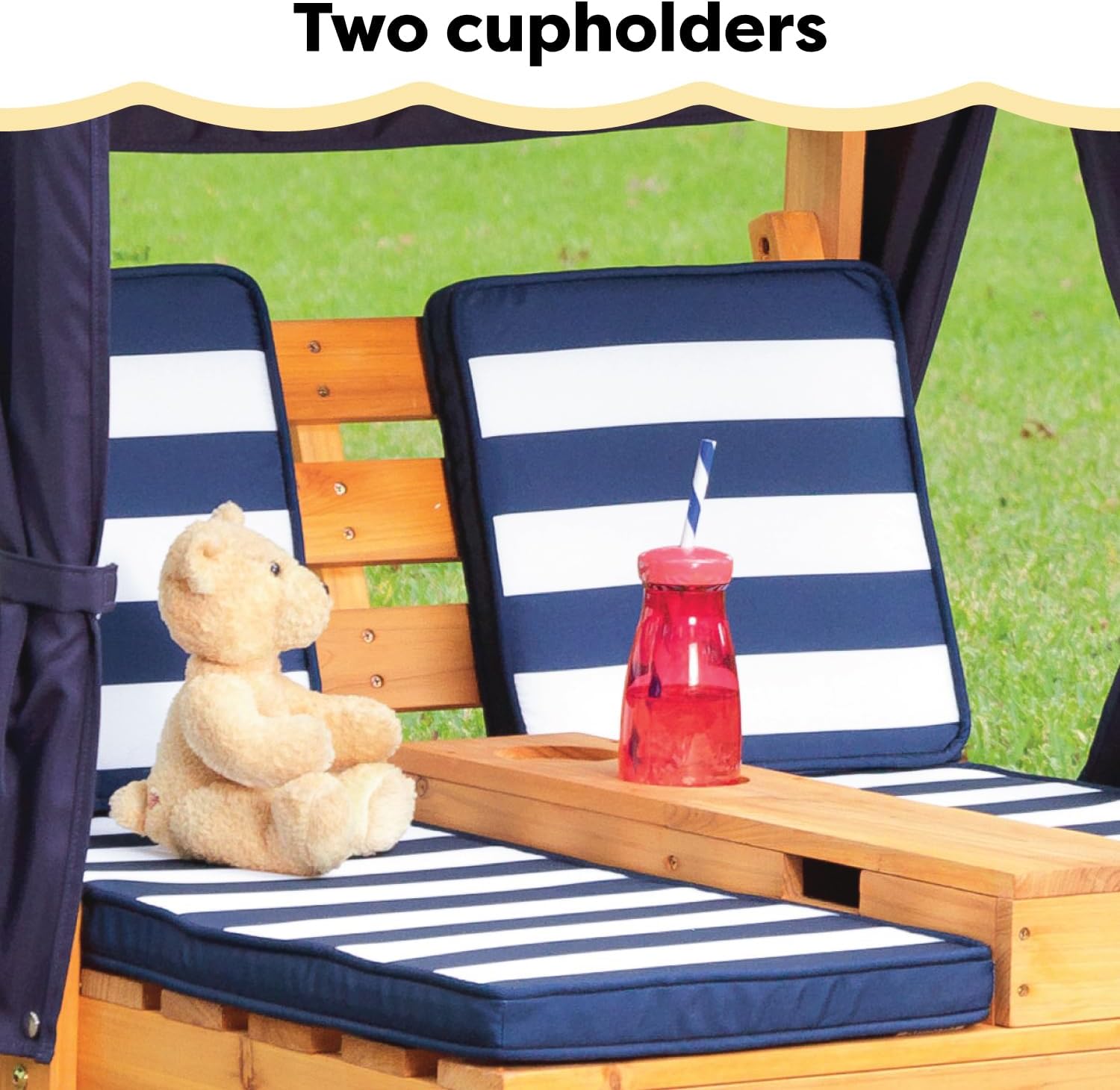 KidKraft Wooden Outdoor Double Chaise Lounge with Cup Holders, Kid's Patio Furniture, Honey with Navy and White Striped Fabric, Gift for Ages 3-8