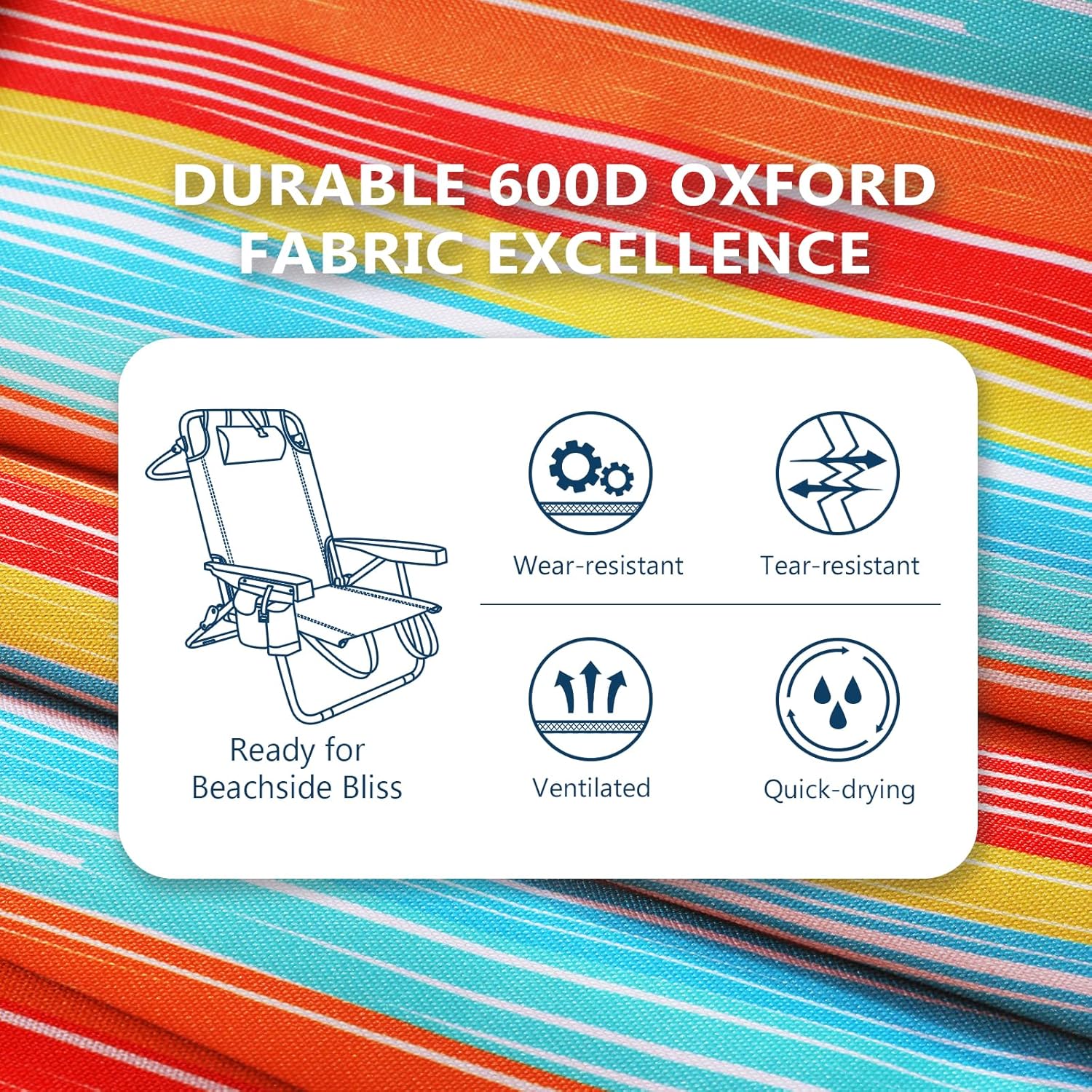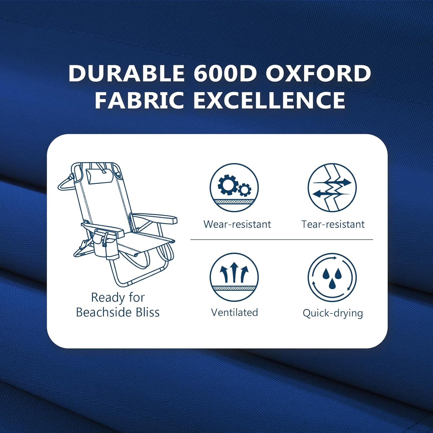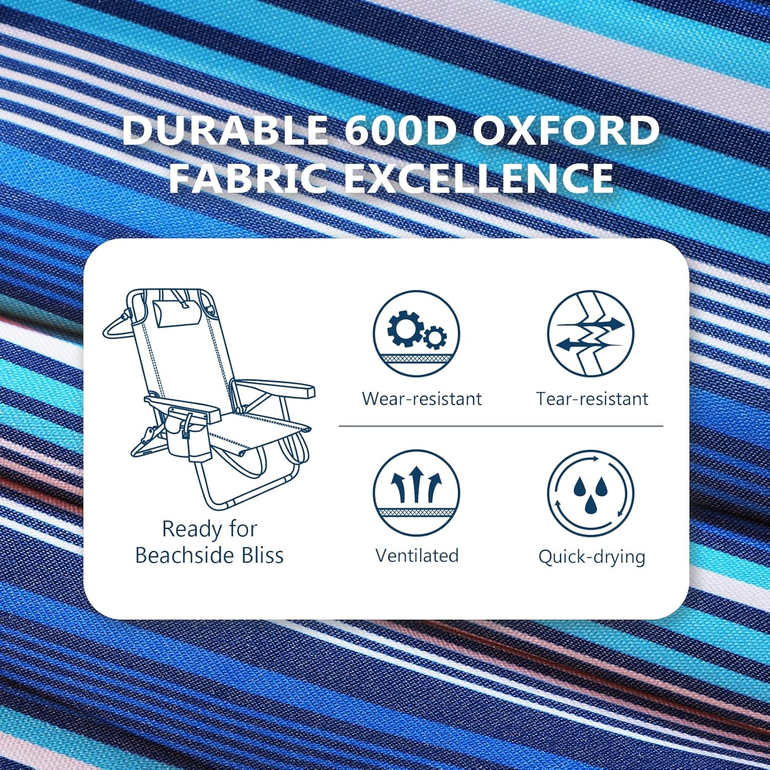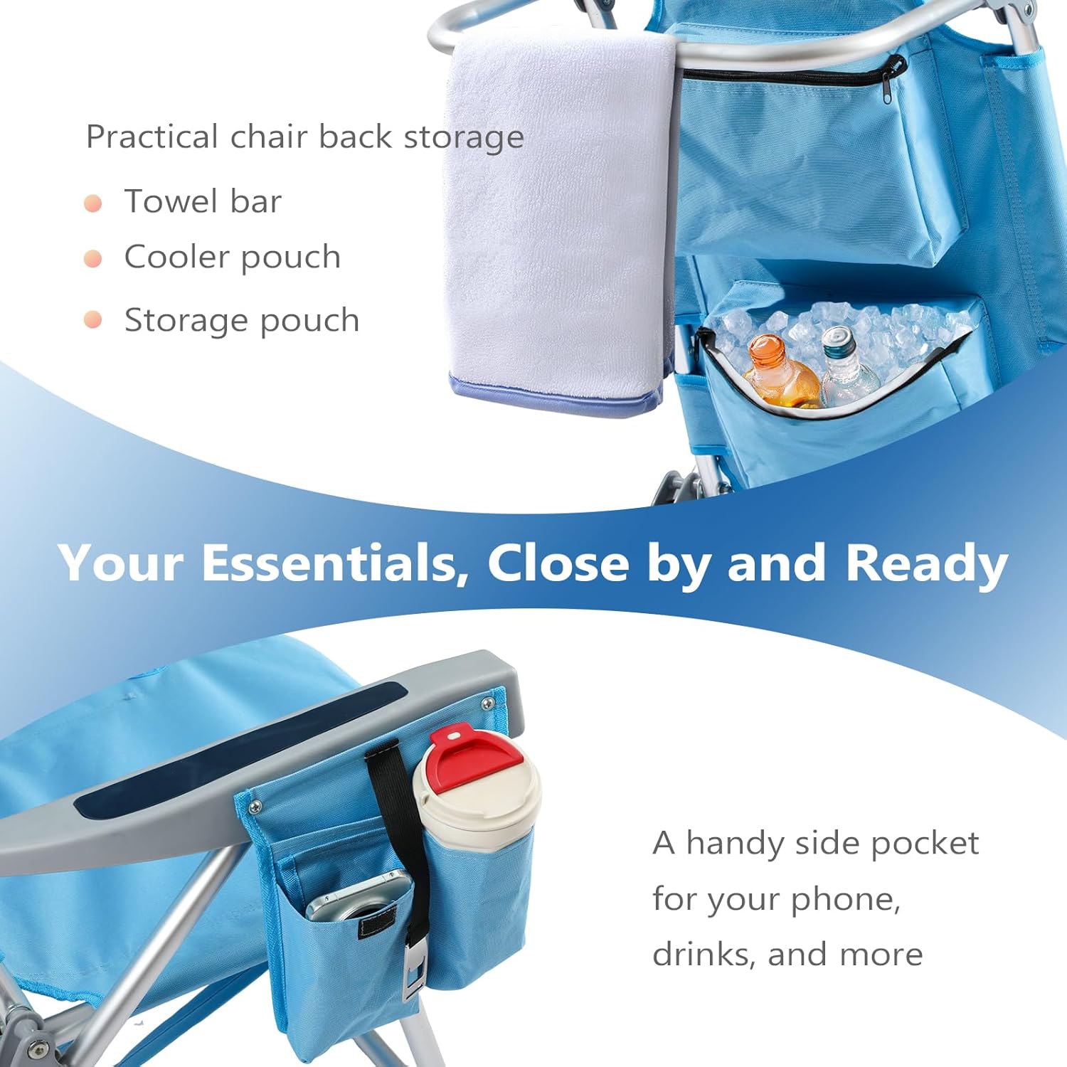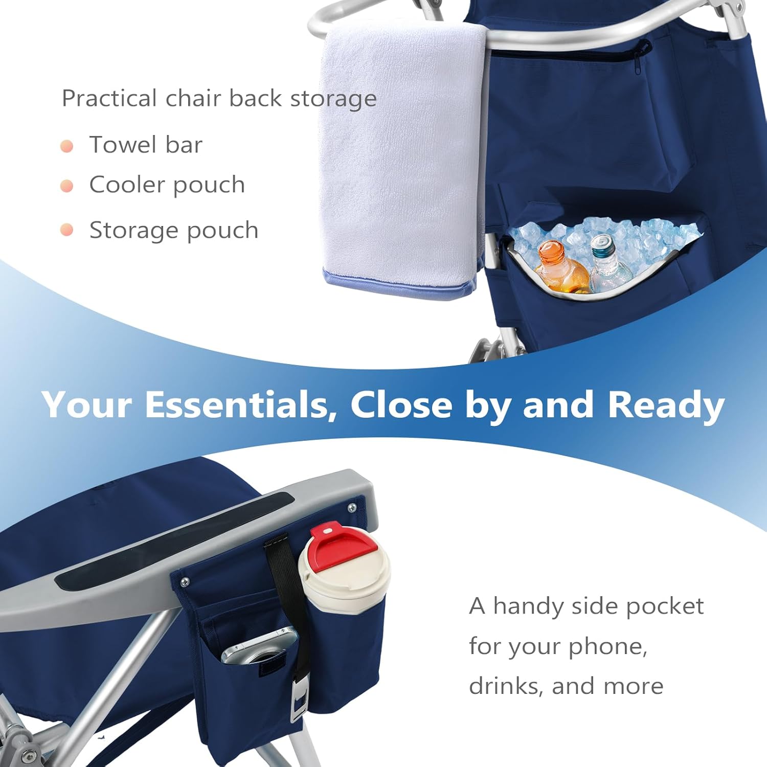 5-Position Aluminum Lay Flat Tall Backpack Beach Chairs 2 Pack Compact Portable Beach Chairs for Adults with Cooler Pouch, Storage Pouch, Towel Bar, Cup Holder & Phone Holder, Blue Stripe