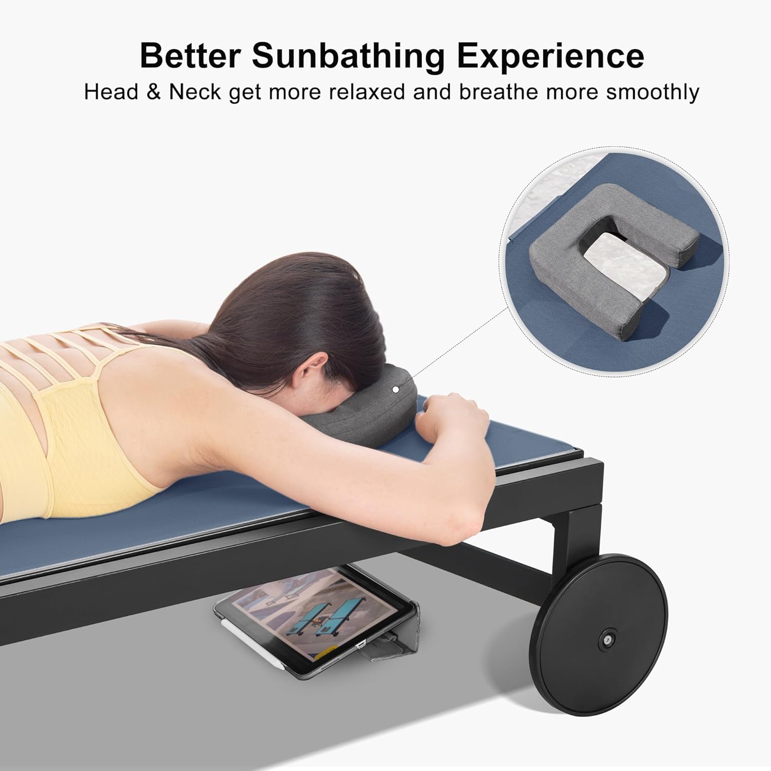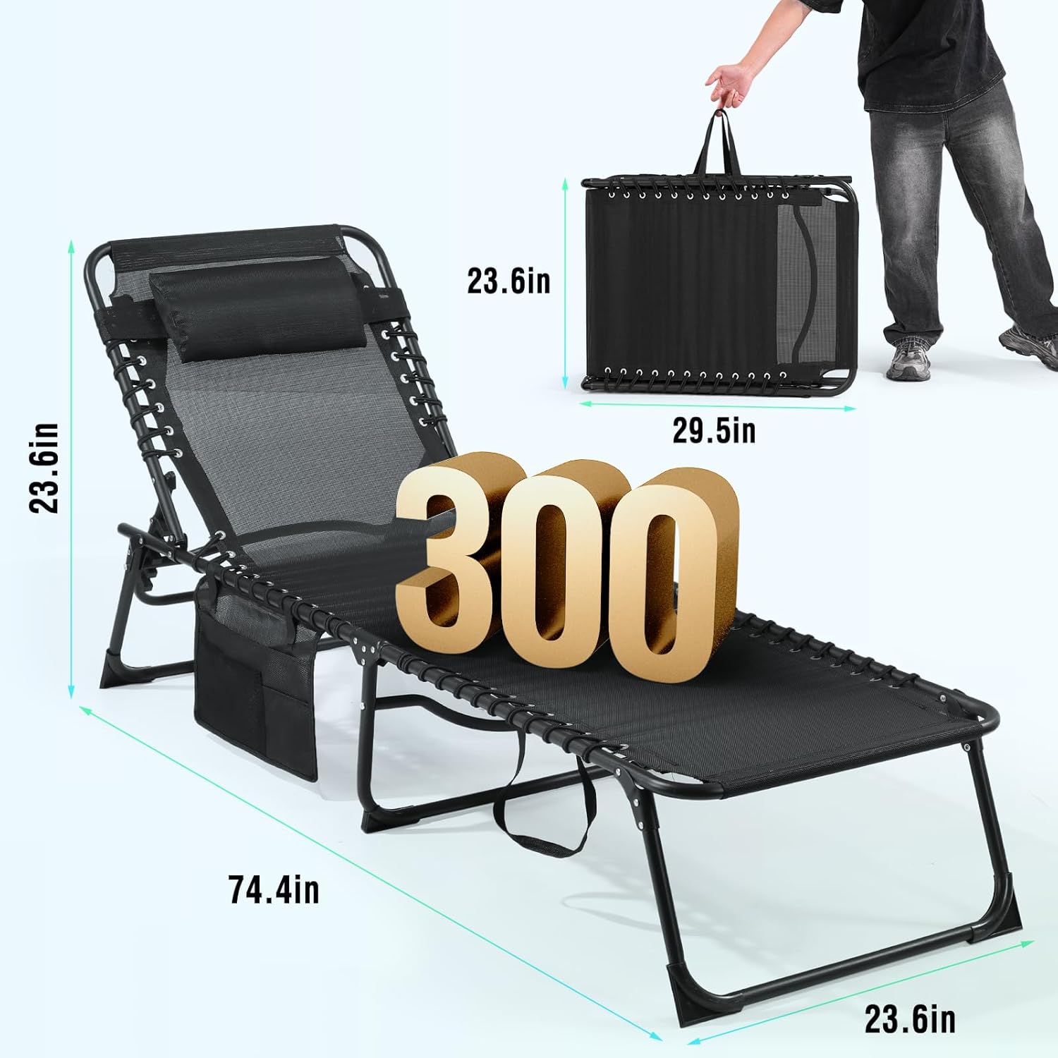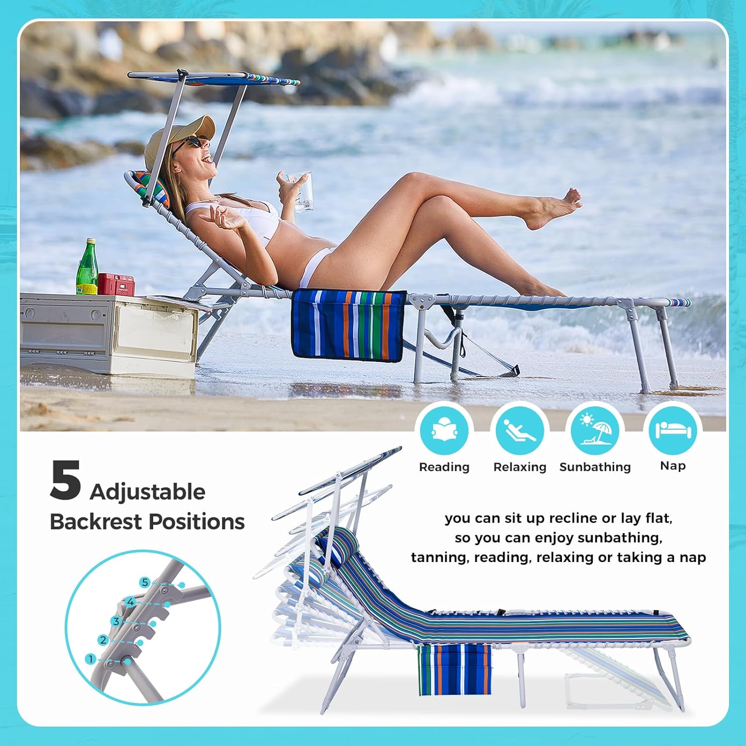 Tanning Chair with Sun Canopy Face Hole, Heavy Duty Folding Chaise Lounge Chair 5 Position Reclining for Adults Outside Reading Sunbathing Poolside Camping Beach, UPF 50+ Sun Shade, 300 LBS