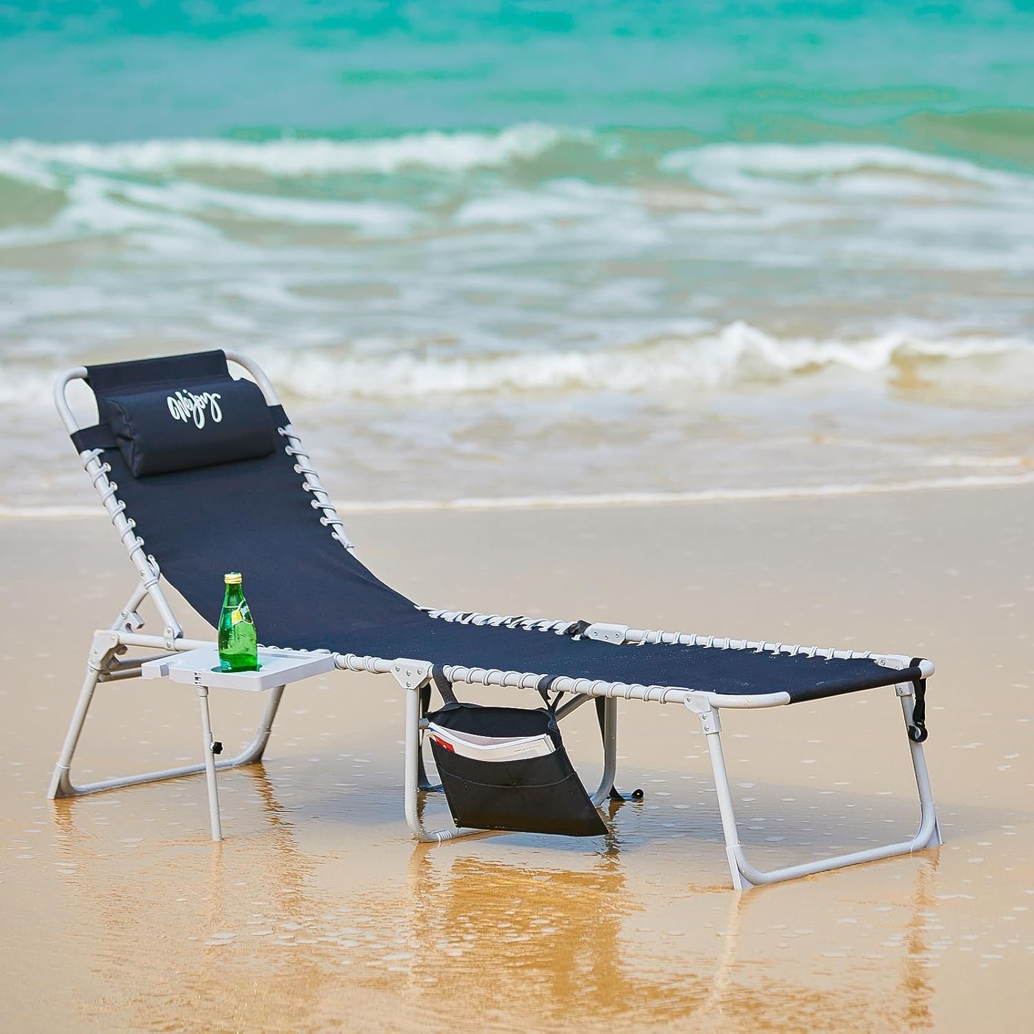 3-in-1 Beach Chair Face Holes Lounge Chair Outdoor with Folding Side Table 5-Position Recliner, Lay Flat Removable Pillow Heavy Duty, Max 330lbs, Poolside, Patio, Camping Backyard Striped Blue