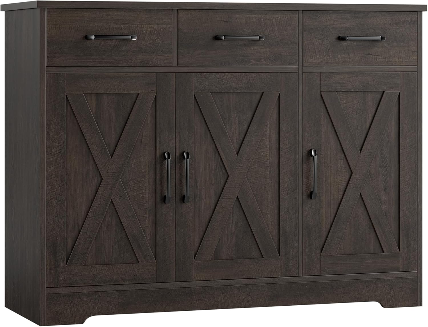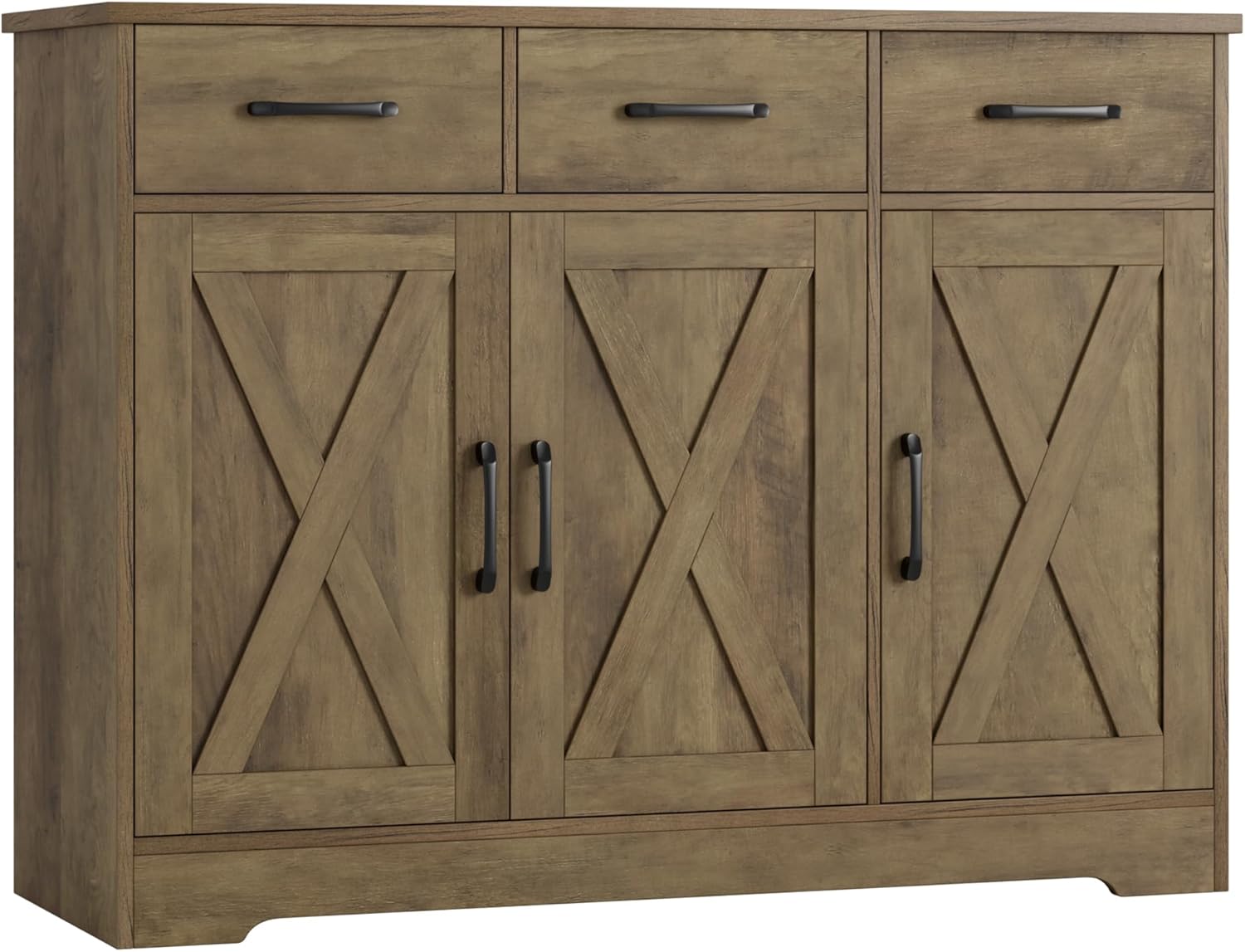 Modern farmhouse sideboard, barn door buffet storage cabinet with drawers and shelves, wooden coffee bar with storage