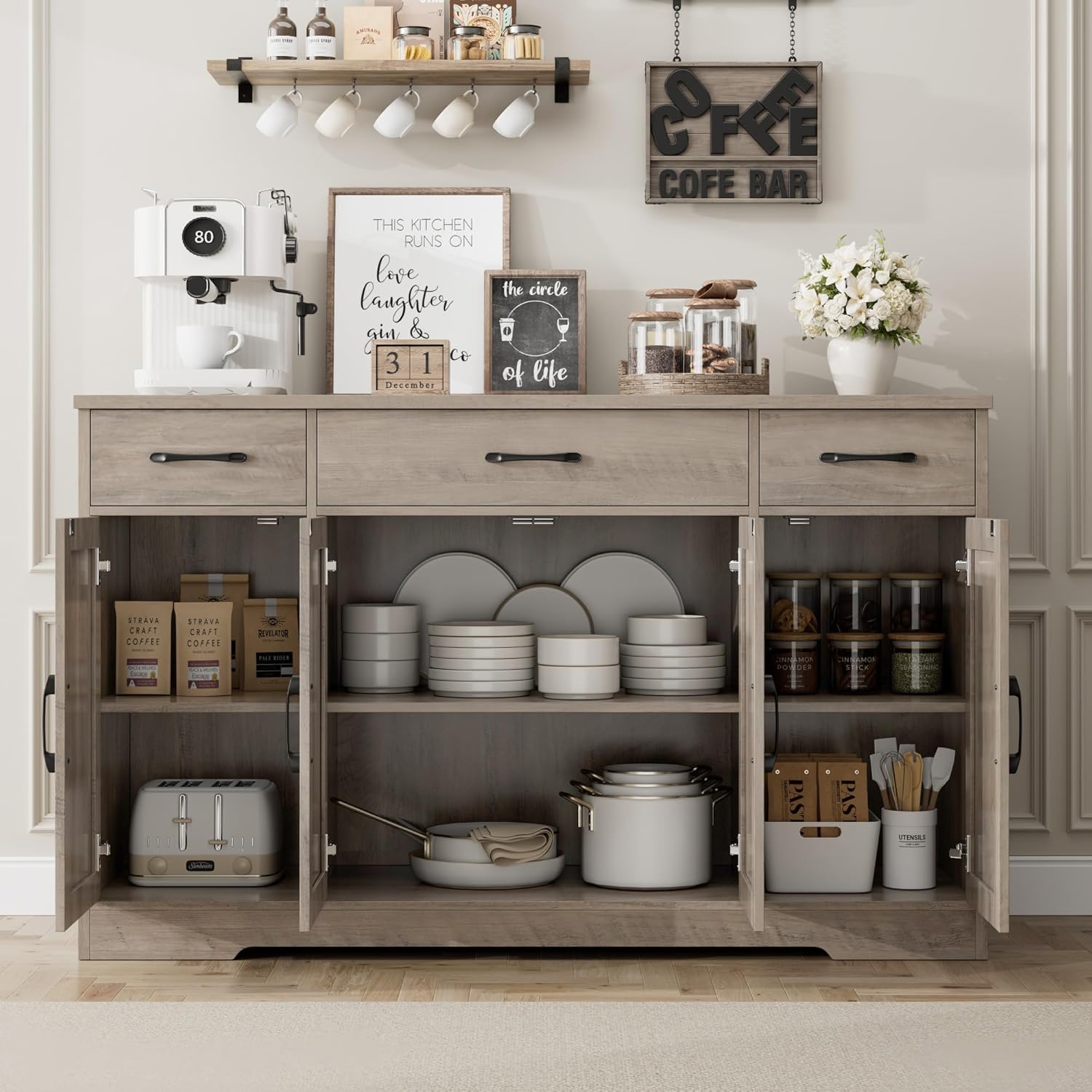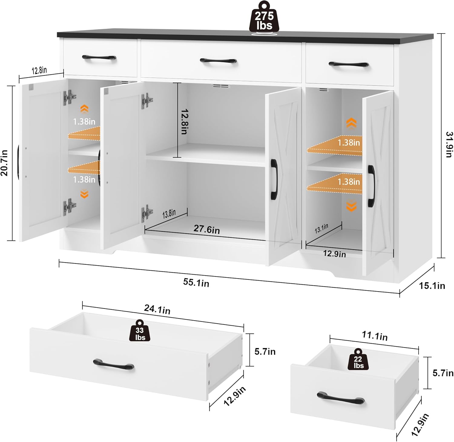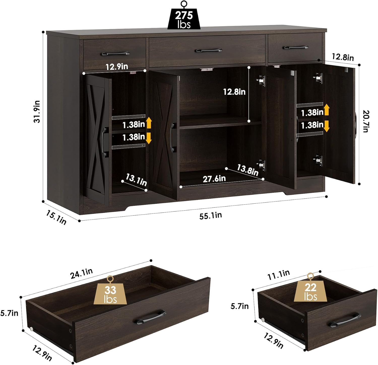 Sideboard with drawers, large 55-inch sideboard, sideboard storage with shelves and doors, modern farmhouse coffee bar wood kitchen dining table