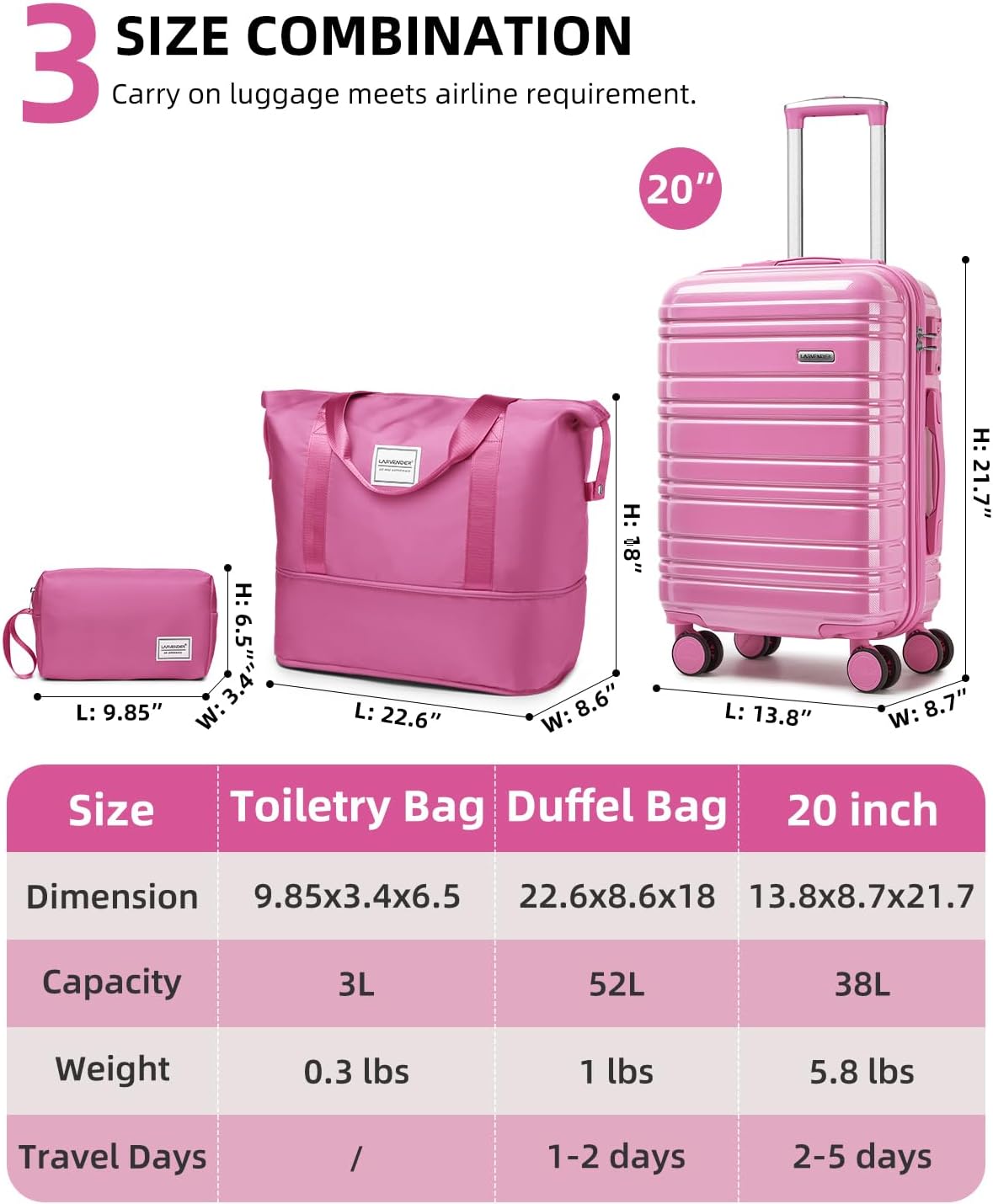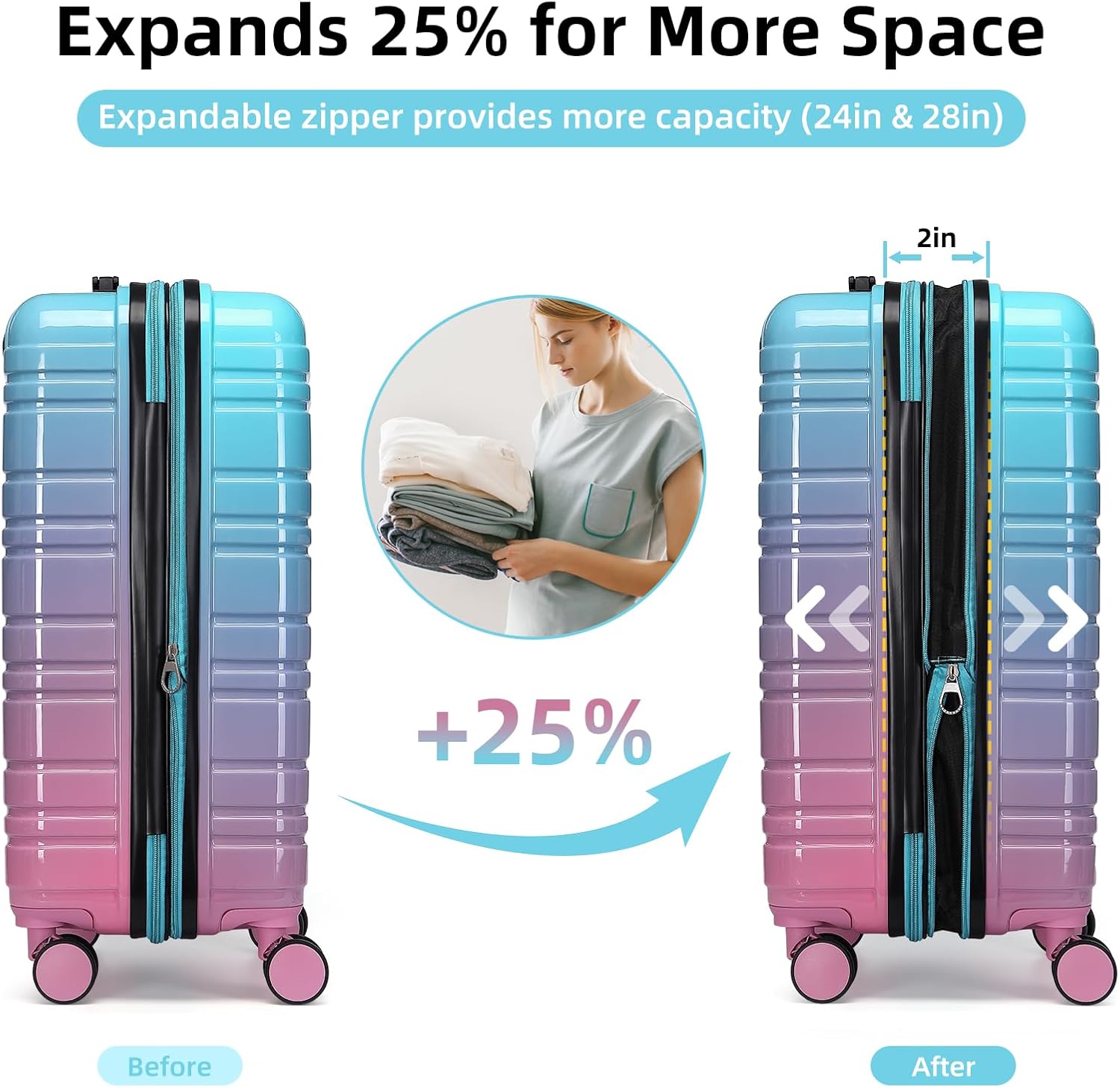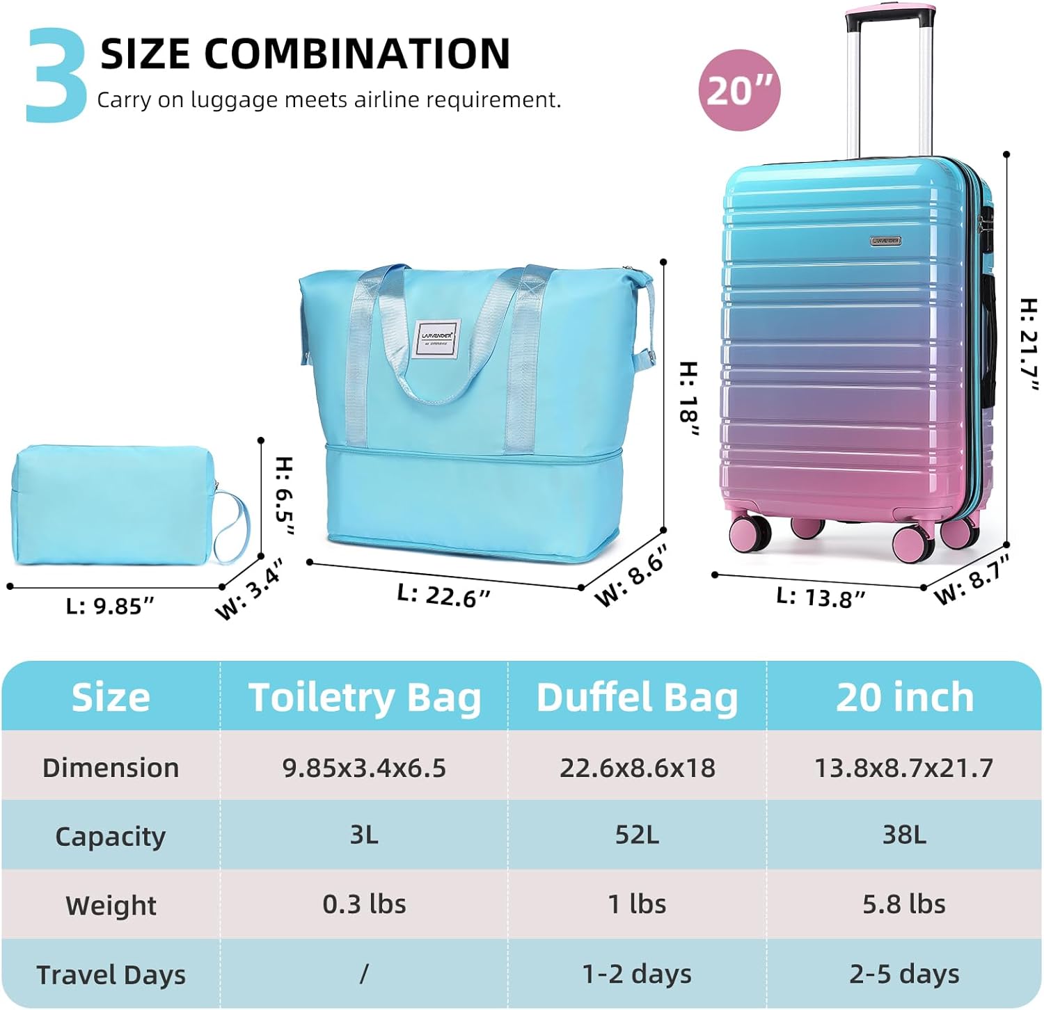 Pack more into your travels with the bright colors luggage set, including the 18"/20" Carry On, 24" Checked, 28" Checked Plus, a travel duffel bag and a toiletry bag.