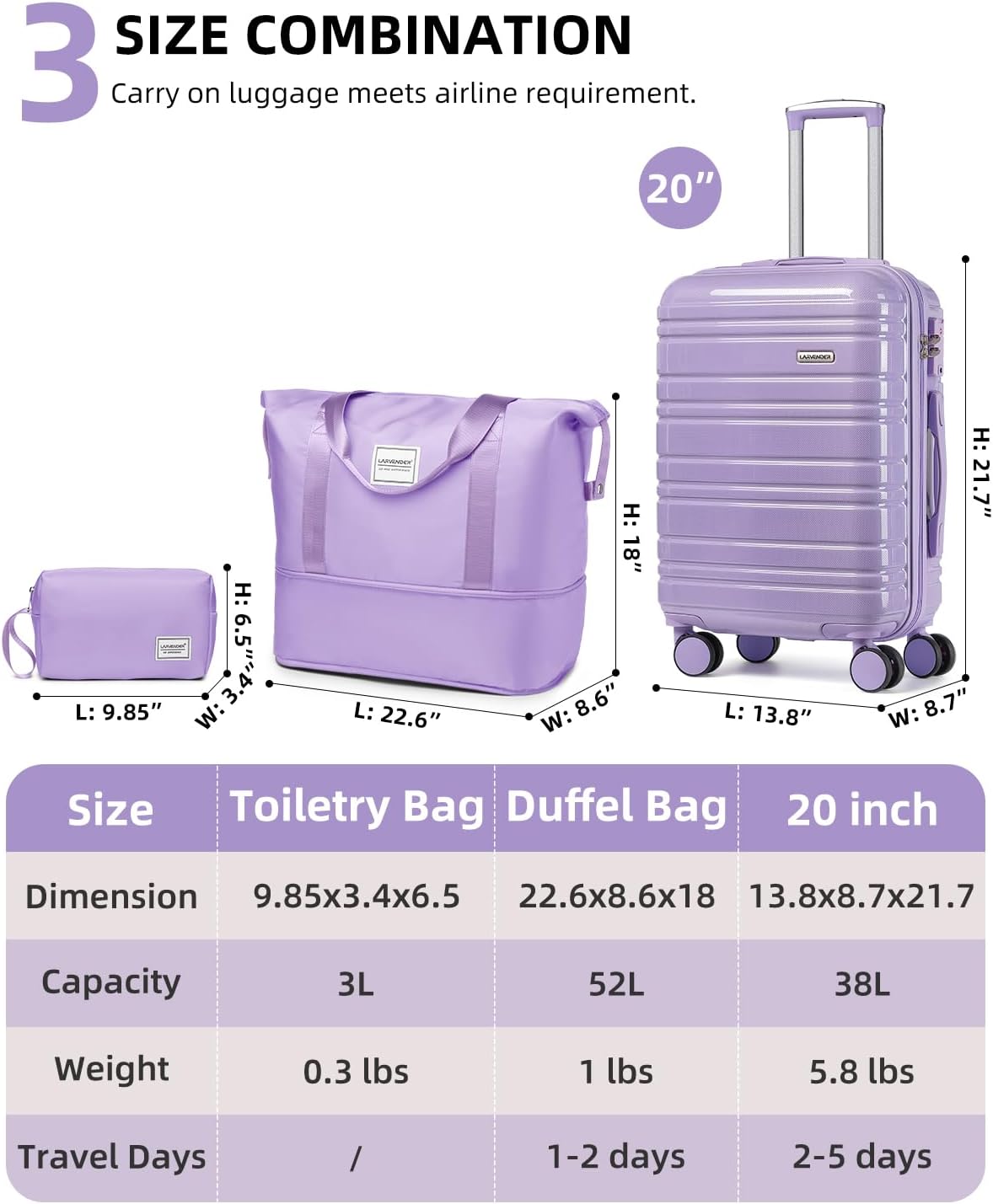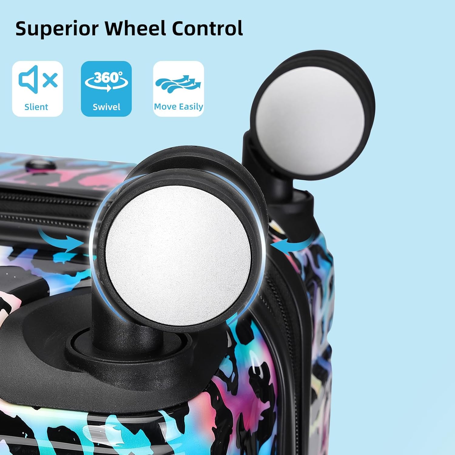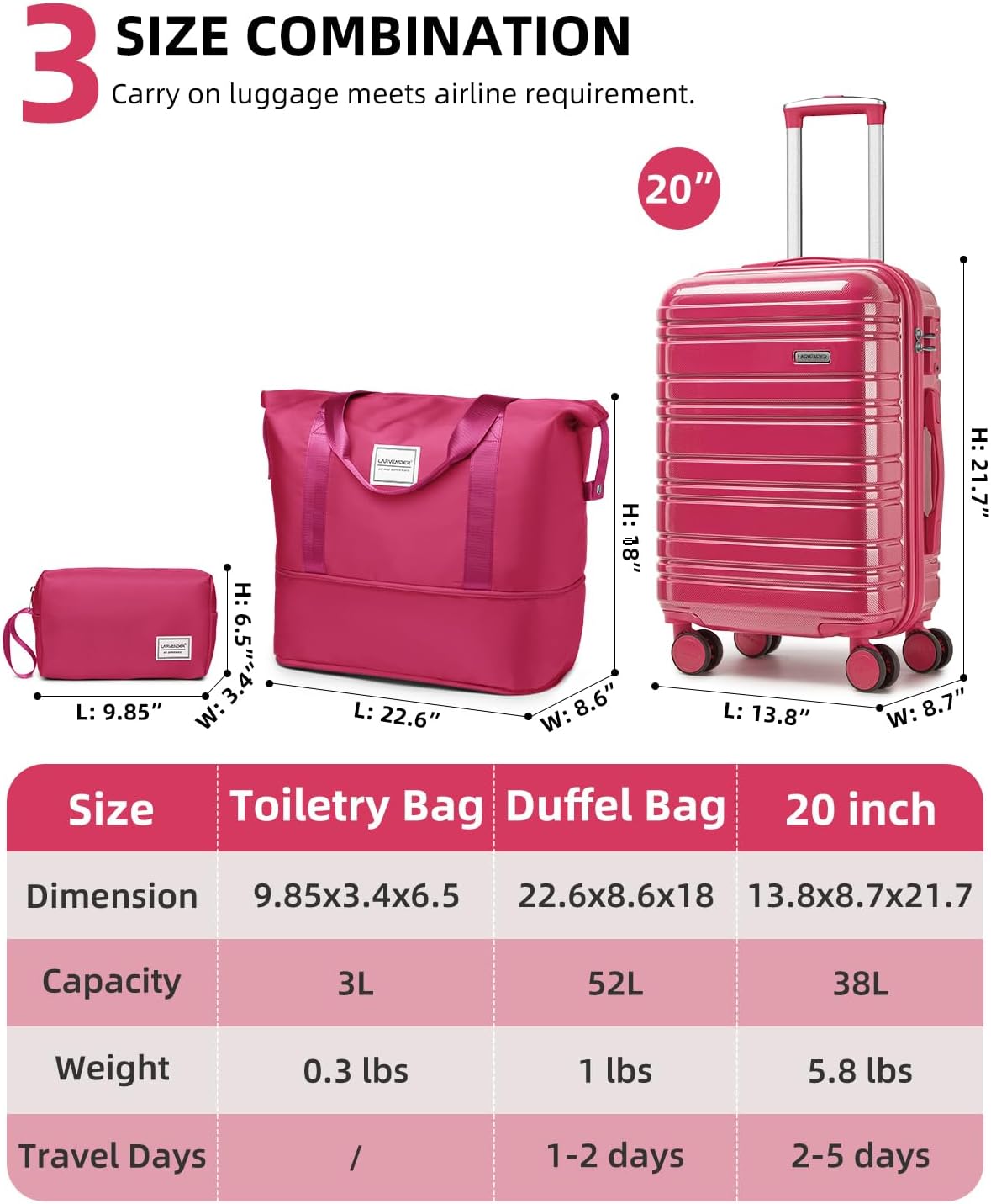 Pack more into your travels with the bright colors luggage set, including the 18"/20" Carry On, 24" Checked, 28" Checked Plus, a travel duffel bag and a toiletry bag.