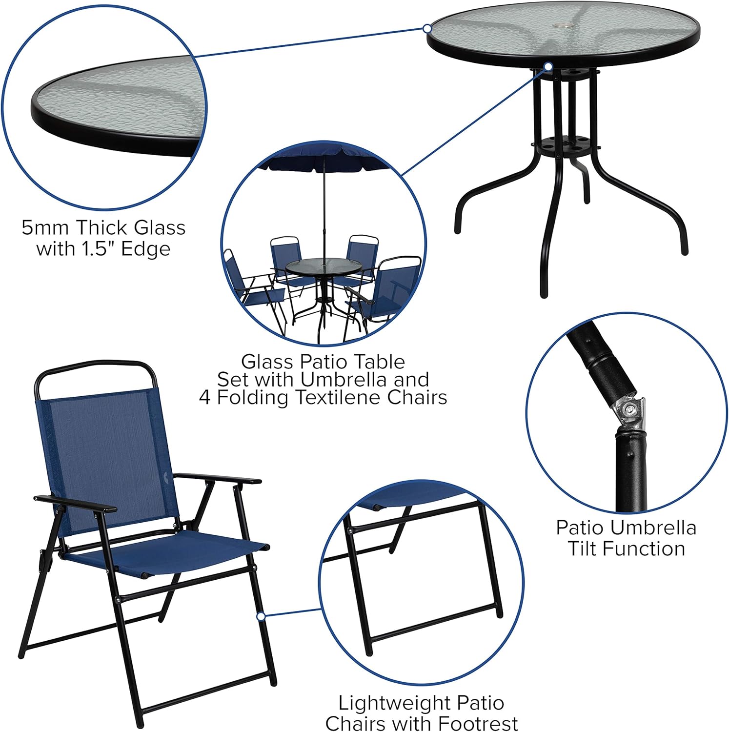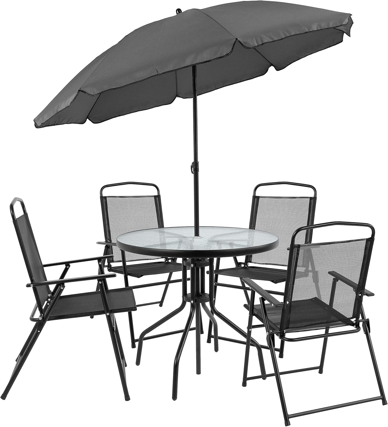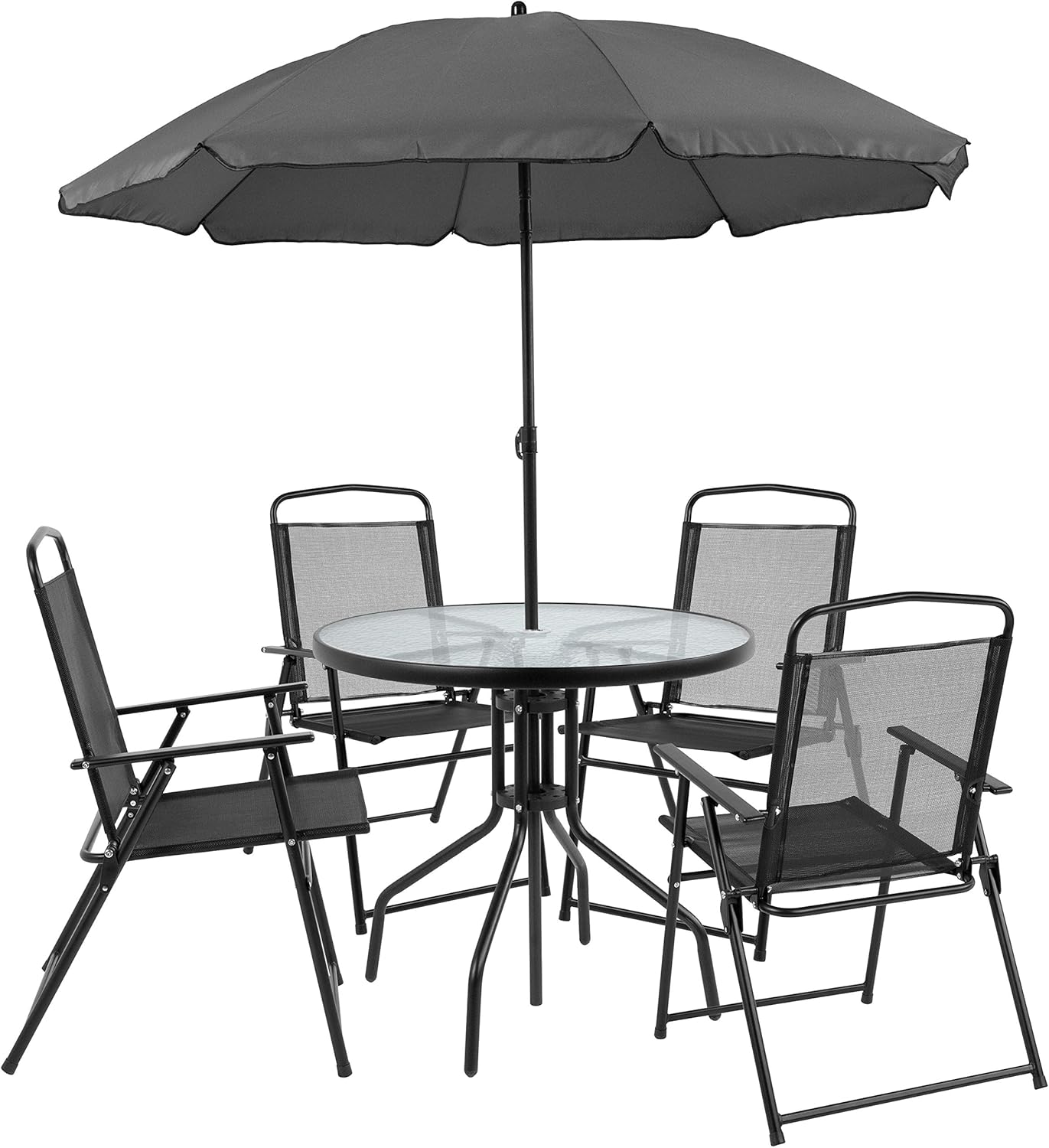 You can enjoy this set quickly, assembly of the table goes up in minutes and the chairs come fully assembled. The folding chairs are upholstered in a durable, breathable textilene material, designed for all-weather use. The attractive rippled tempered glass sits atop a 4-legged metal framed base. The included umbrella will shade you on those sunny days and has a tilt function that is activated by pushing the plastic ring on the pole. For longevity, care should be taken to protect from long periods of wet weather. Clean with a water based cleaning solution to keep in pristine condition.