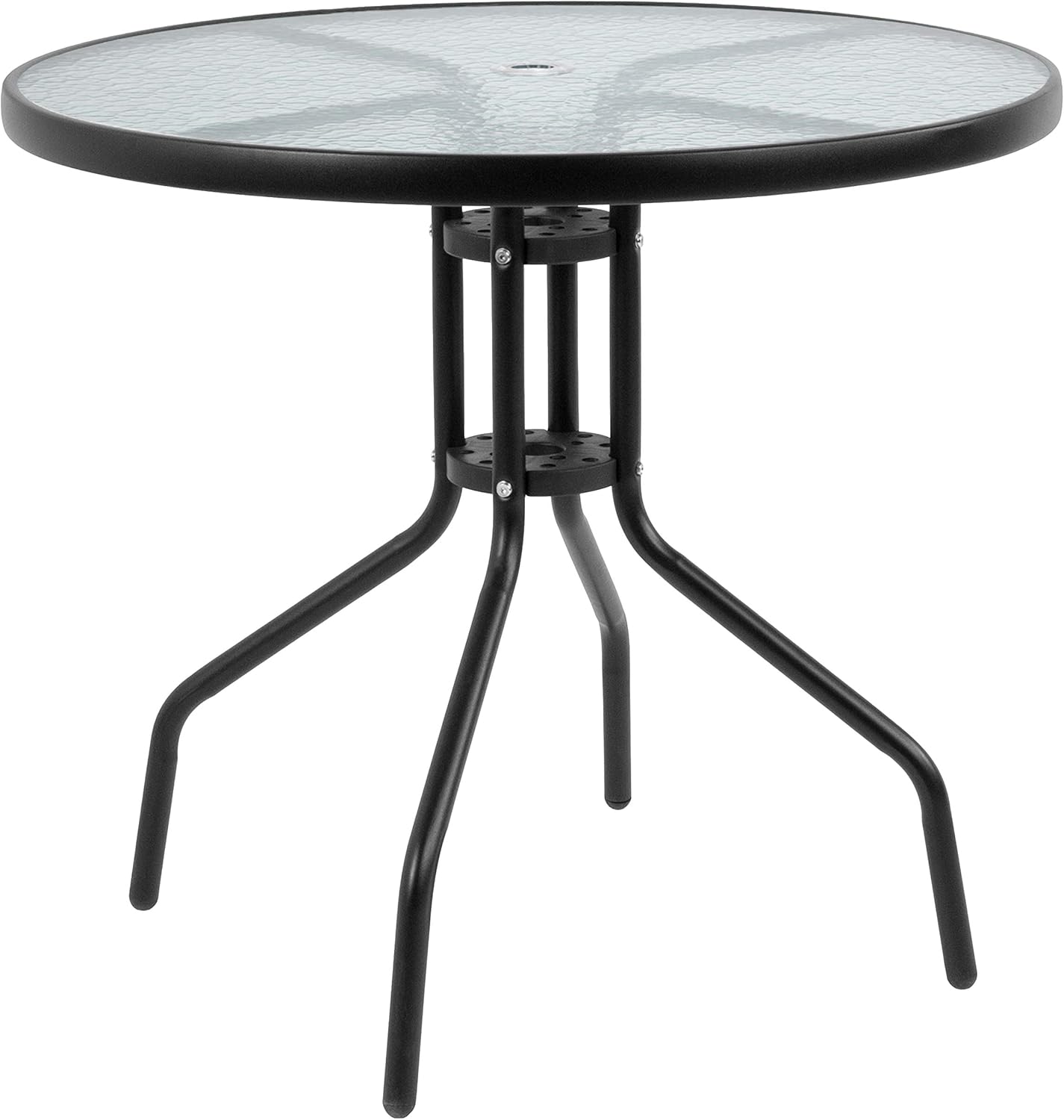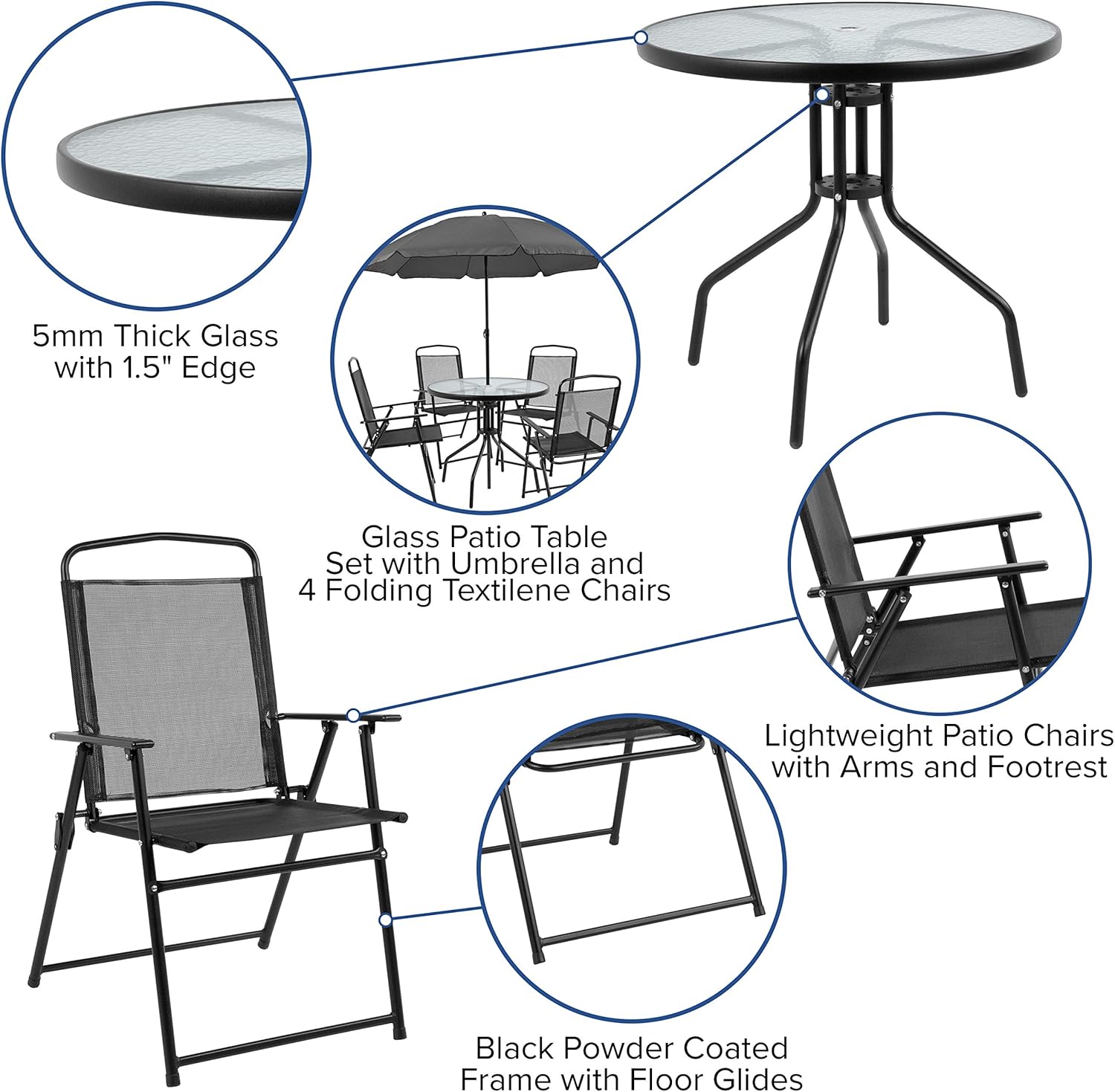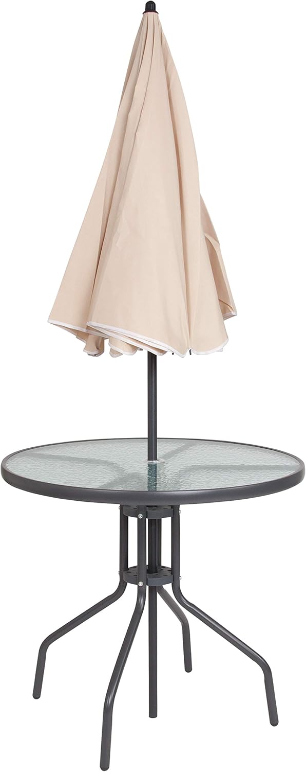 You can enjoy this set quickly, assembly of the table goes up in minutes and the chairs come fully assembled. The folding chairs are upholstered in a durable, breathable textilene material, designed for all-weather use. The attractive rippled tempered glass sits atop a 4-legged metal framed base. The included umbrella will shade you on those sunny days and has a tilt function that is activated by pushing the plastic ring on the pole. For longevity, care should be taken to protect from long periods of wet weather. Clean with a water based cleaning solution to keep in pristine condition.