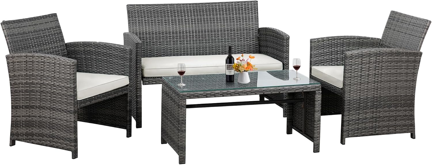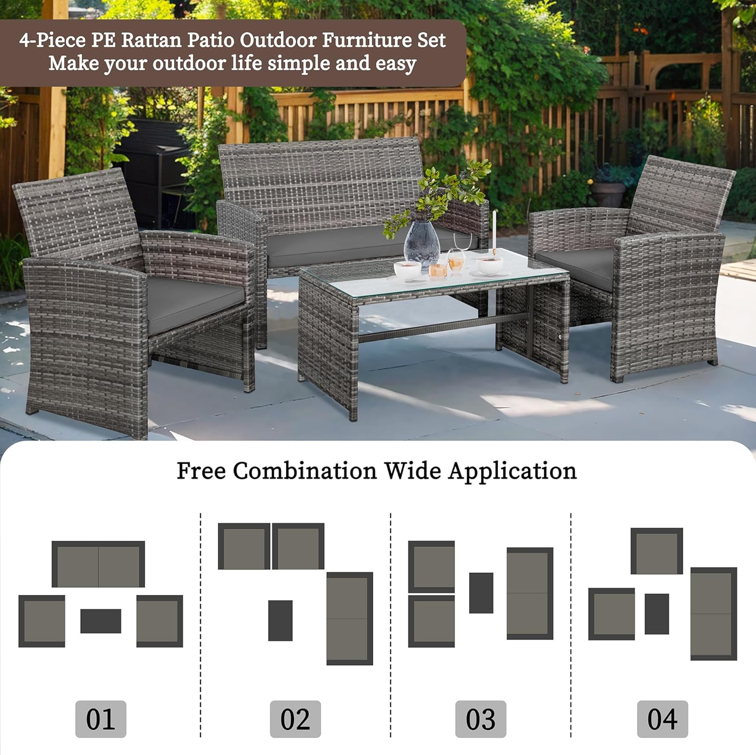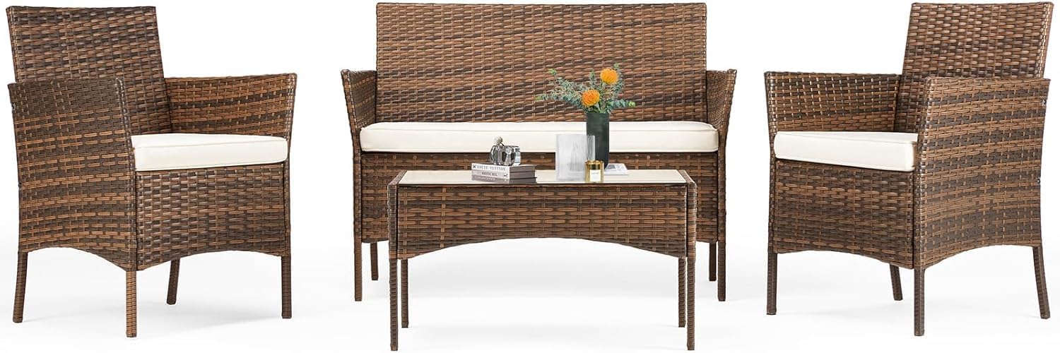 Shintenchi 4-Piece Patio Furniture Set, Outdoor Wicker Patio Conversation Furniture Set with Cushions and Wooden Tabletop