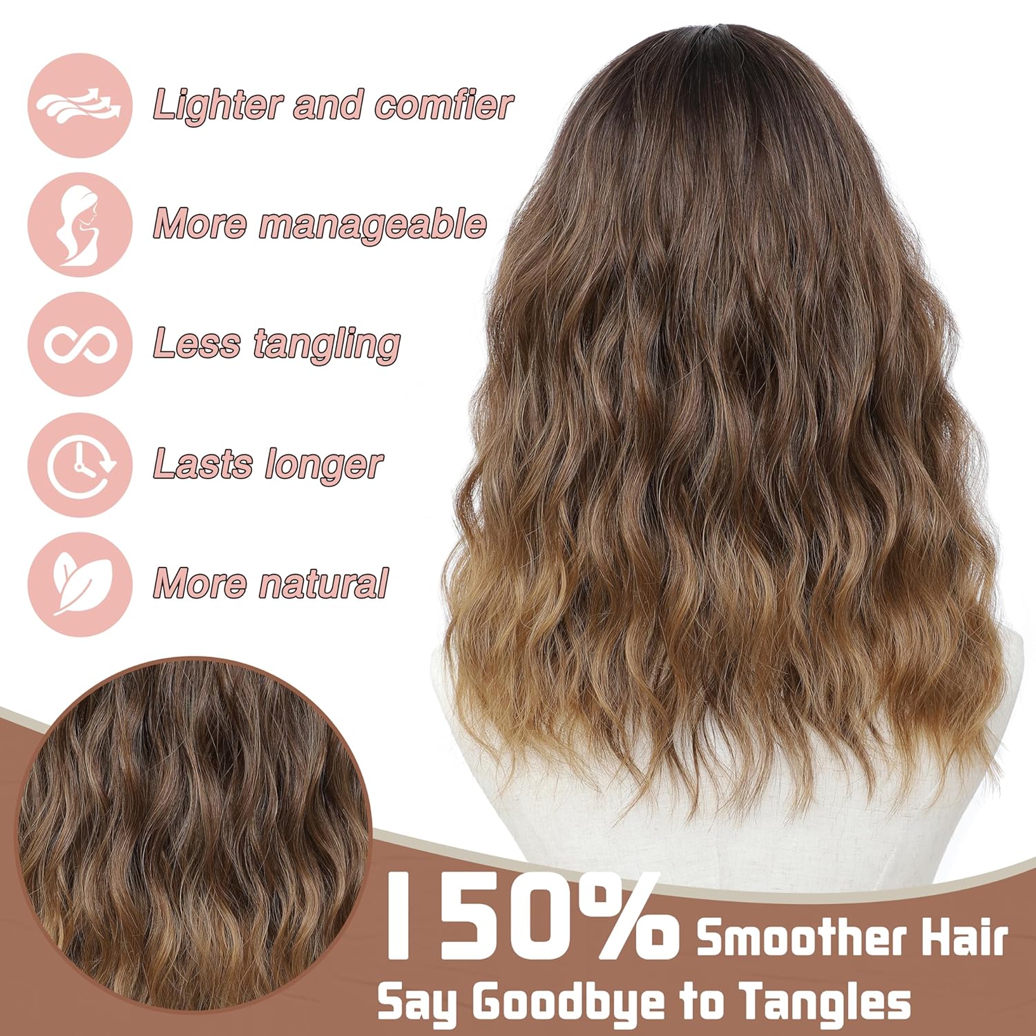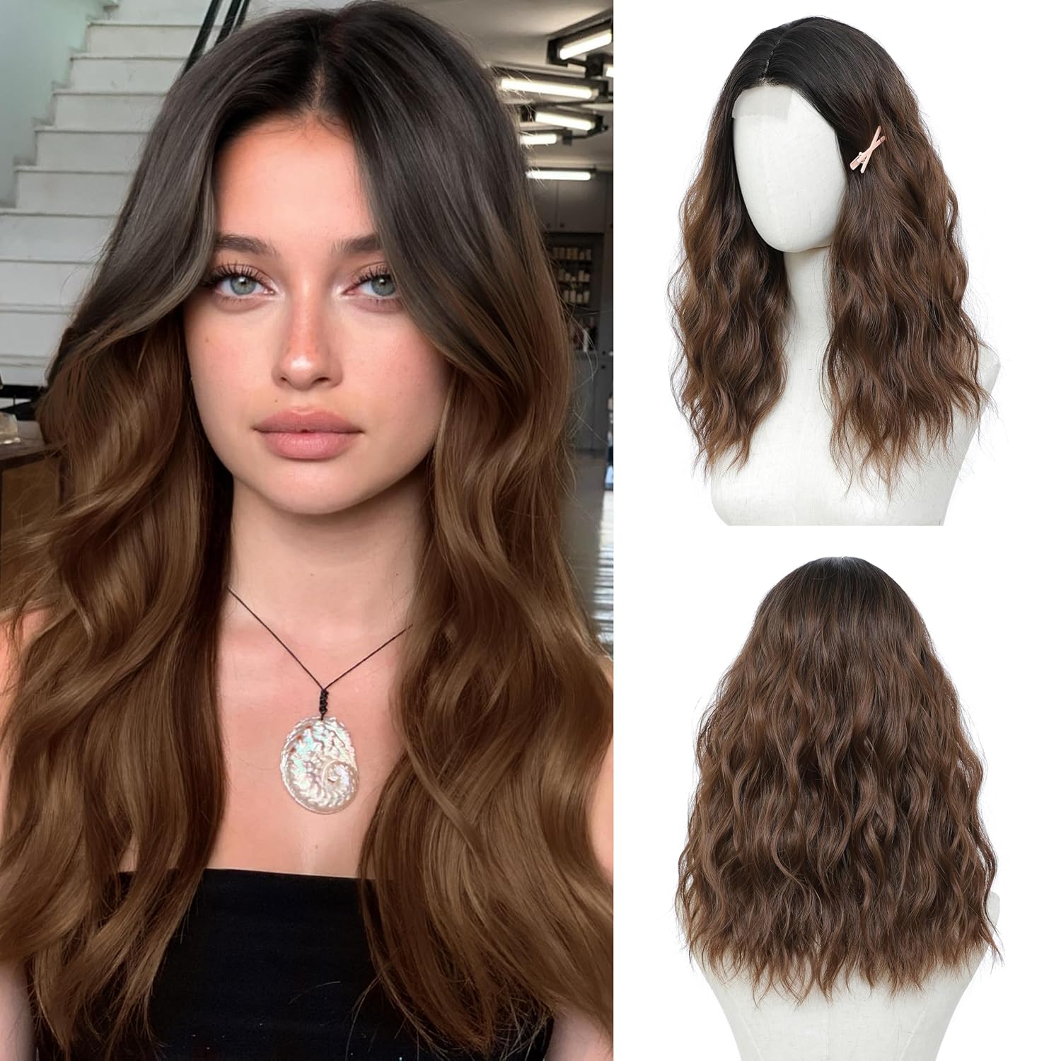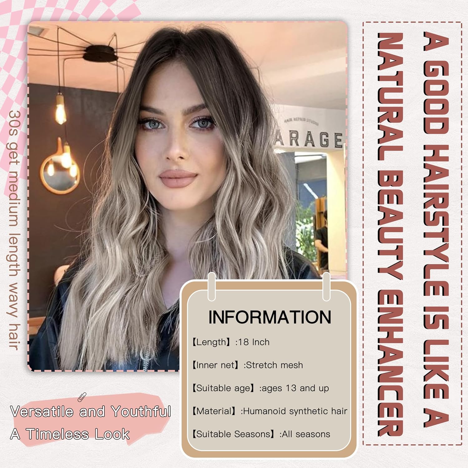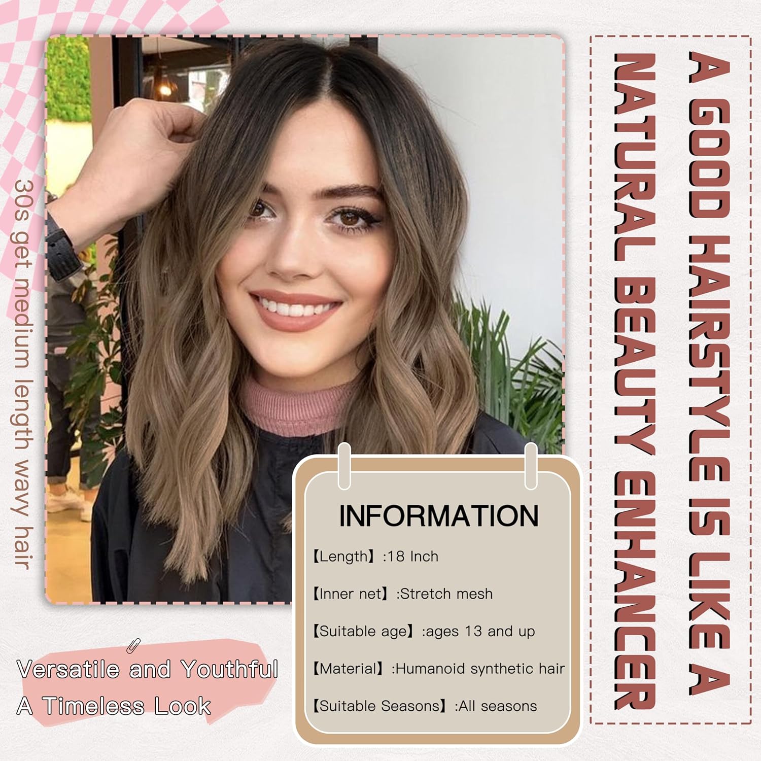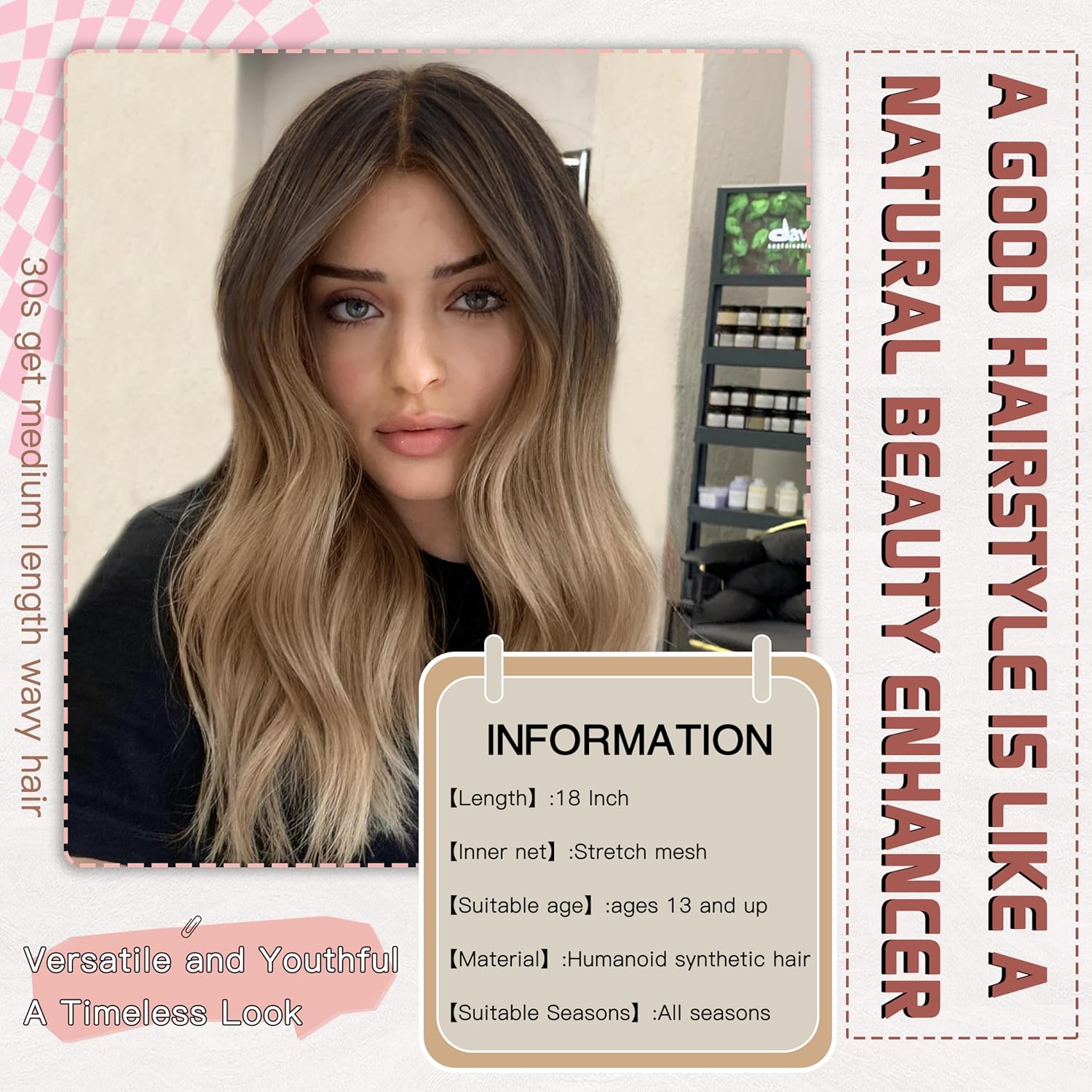 Brown Highlights18" Natural Medium Length Synthetic Wavy Wig for Women