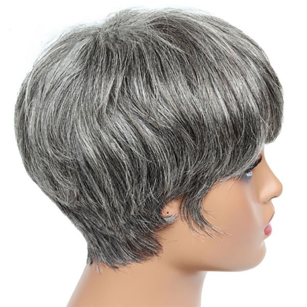Short Salt And Pepper Grey Human Hair Pixie Cut Bob Bangs Wig