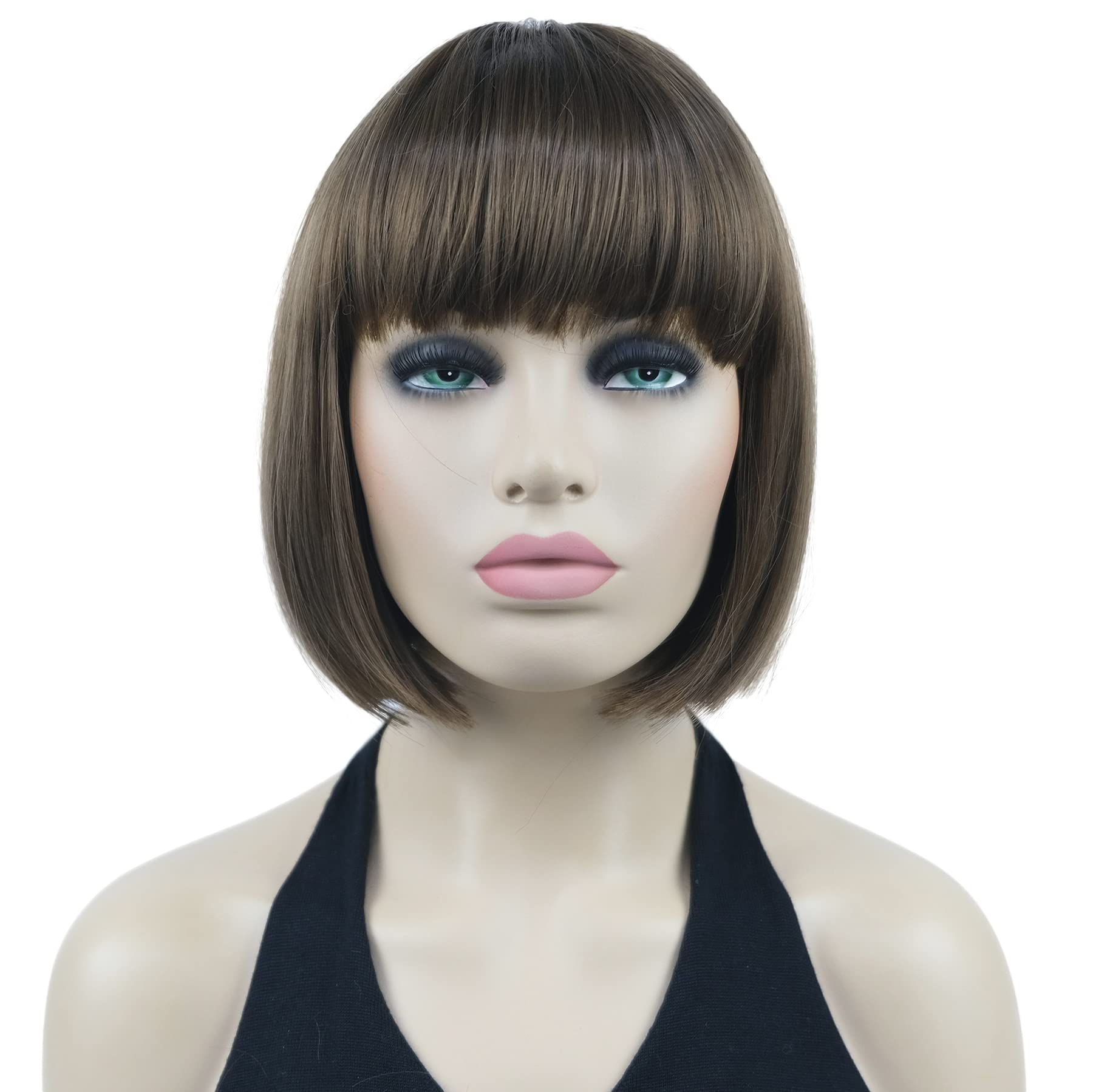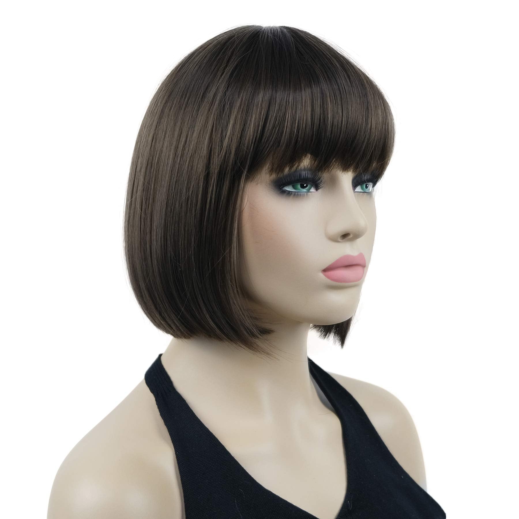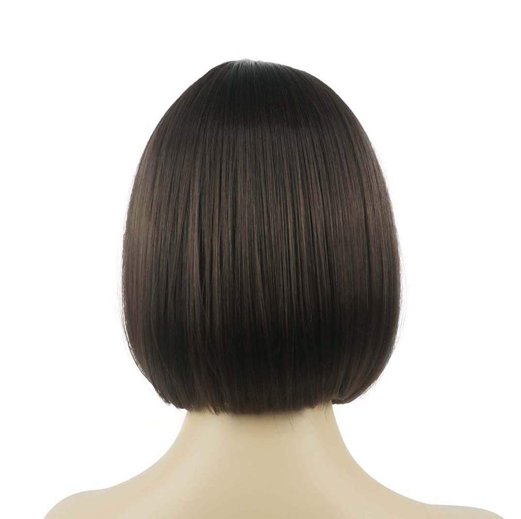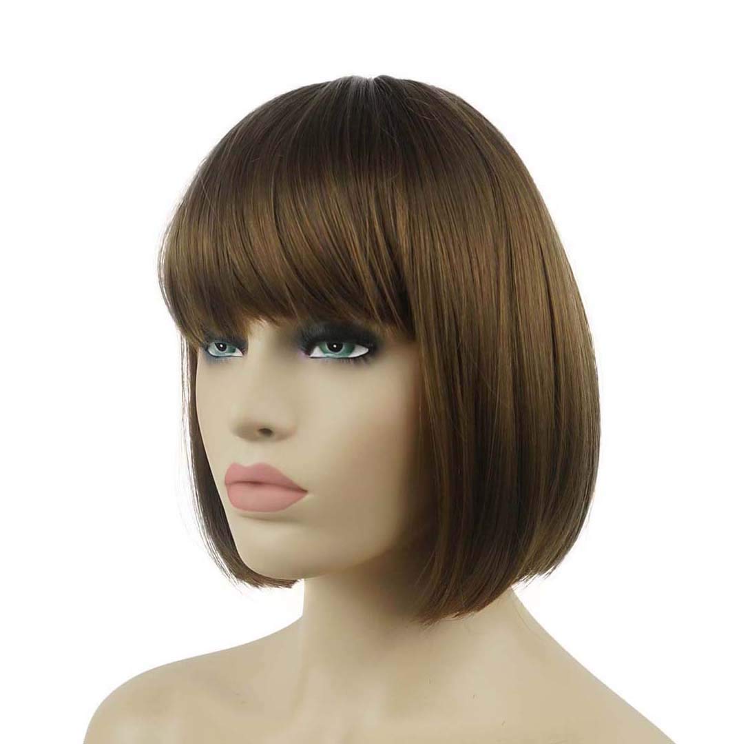 8" Straight Short Bob Hair Flat Bangs Cute Central Dot Skin Top Heat Resistant Synthetic Wigs (6 Chestnut Brown)