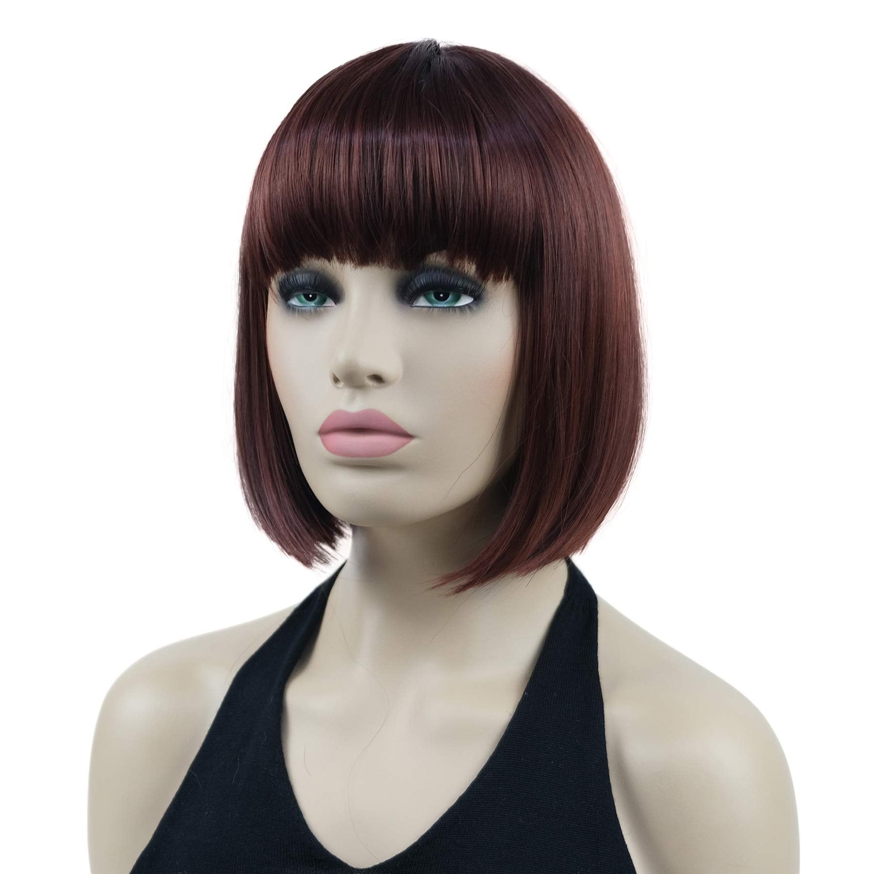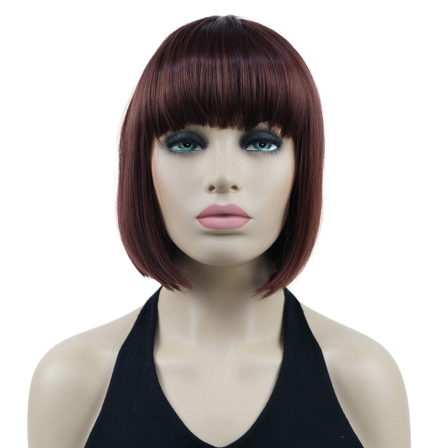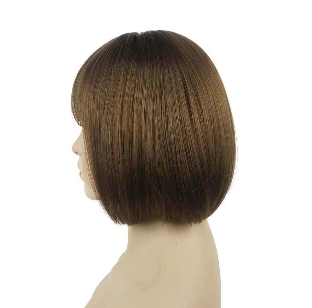 8" Straight Short Bob Hair Flat Bangs Cute Central Dot Skin Top Heat Resistant Synthetic Wigs (6 Chestnut Brown)