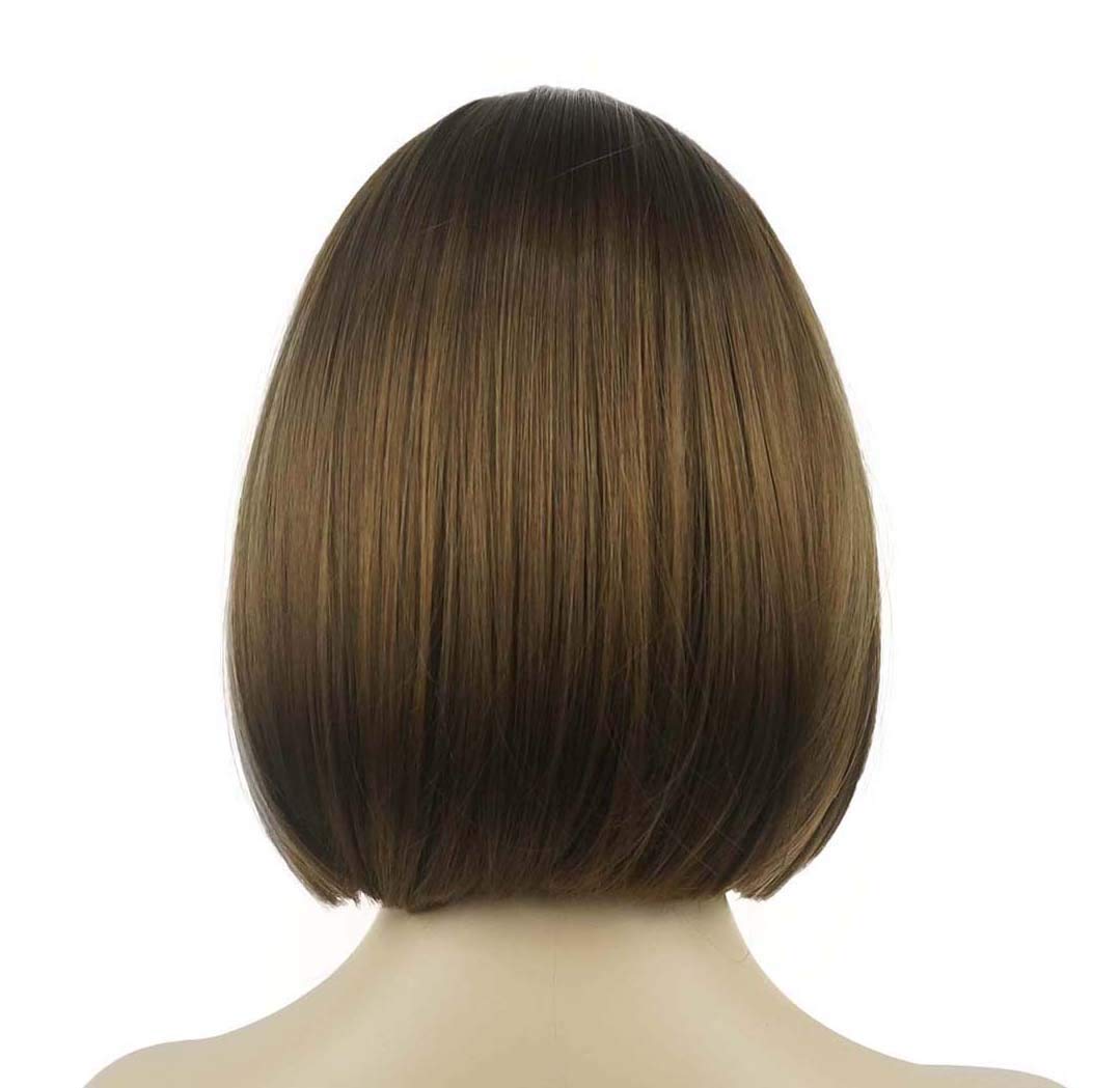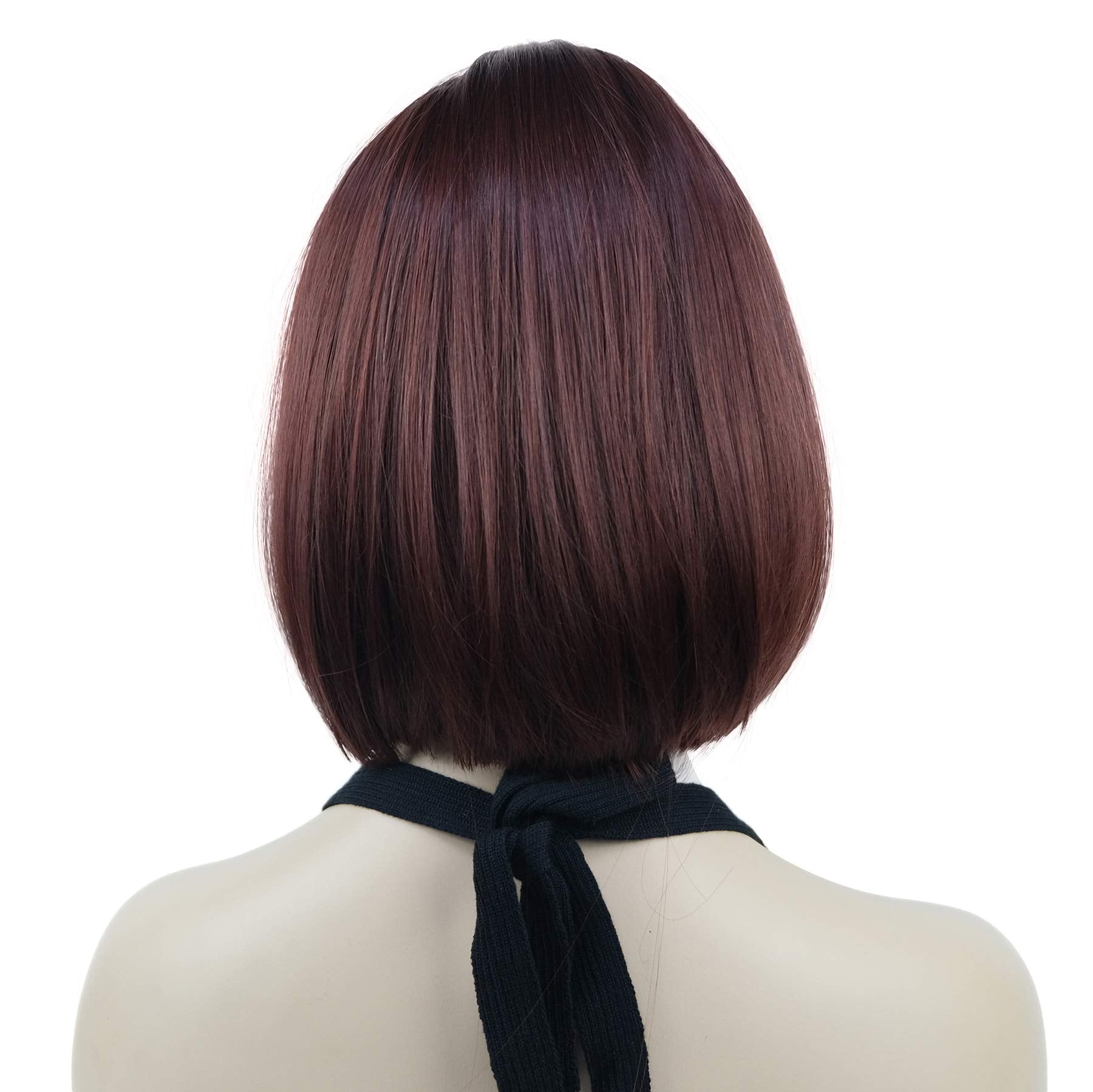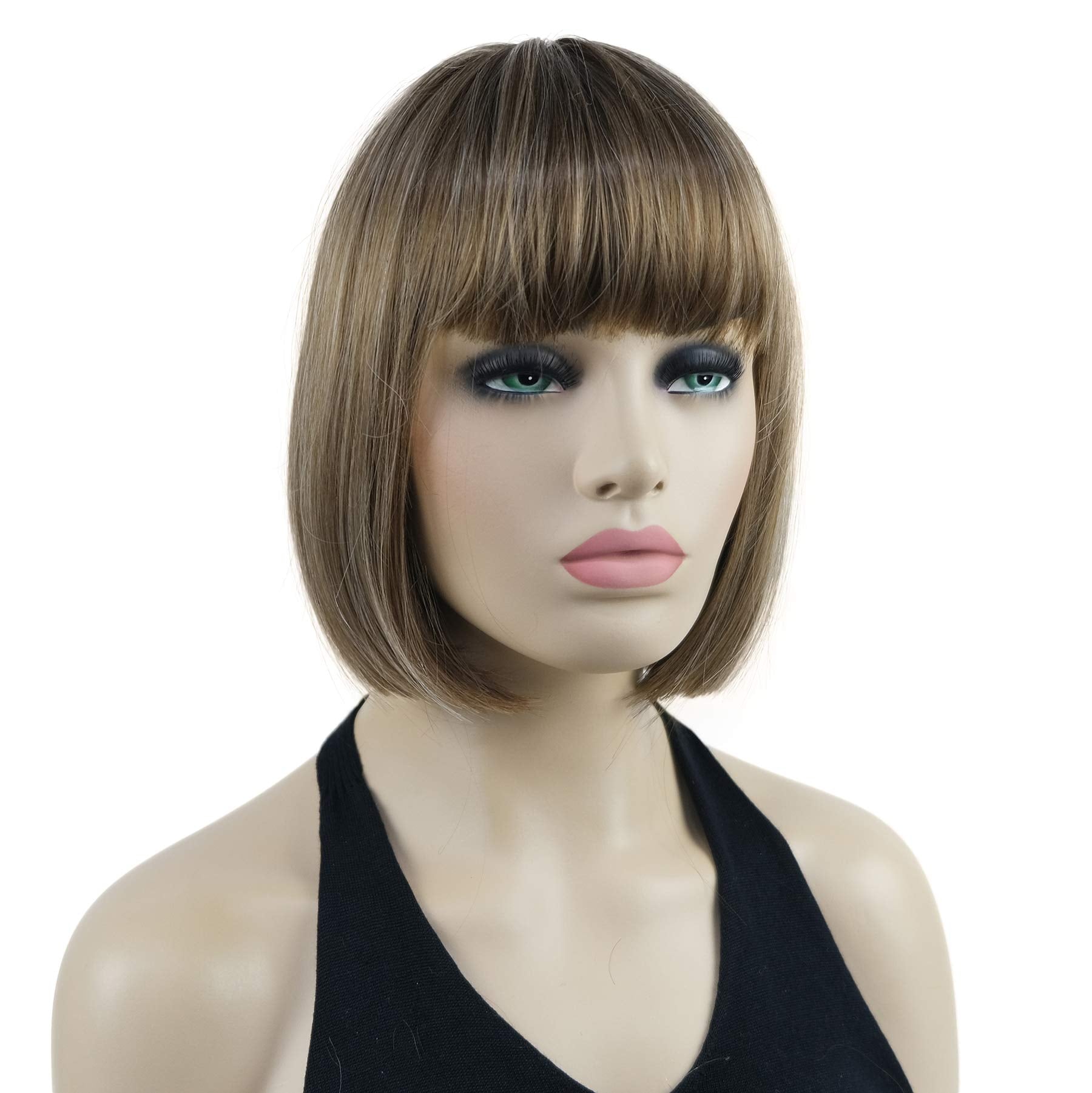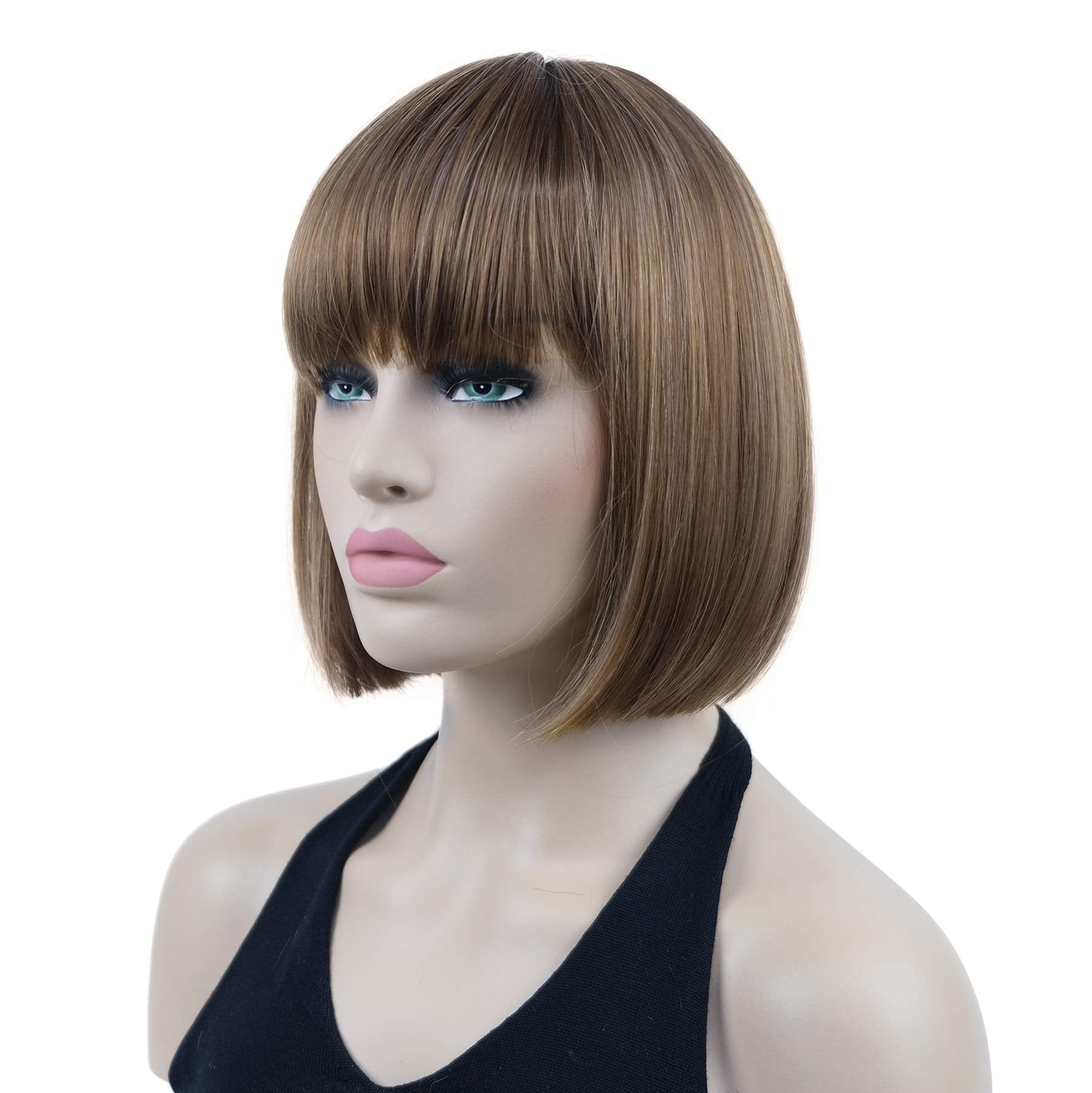 8" Straight Short Bob Hair Flat Bangs Cute Central Dot Skin Top Heat Resistant Synthetic Wigs (6 Chestnut Brown)