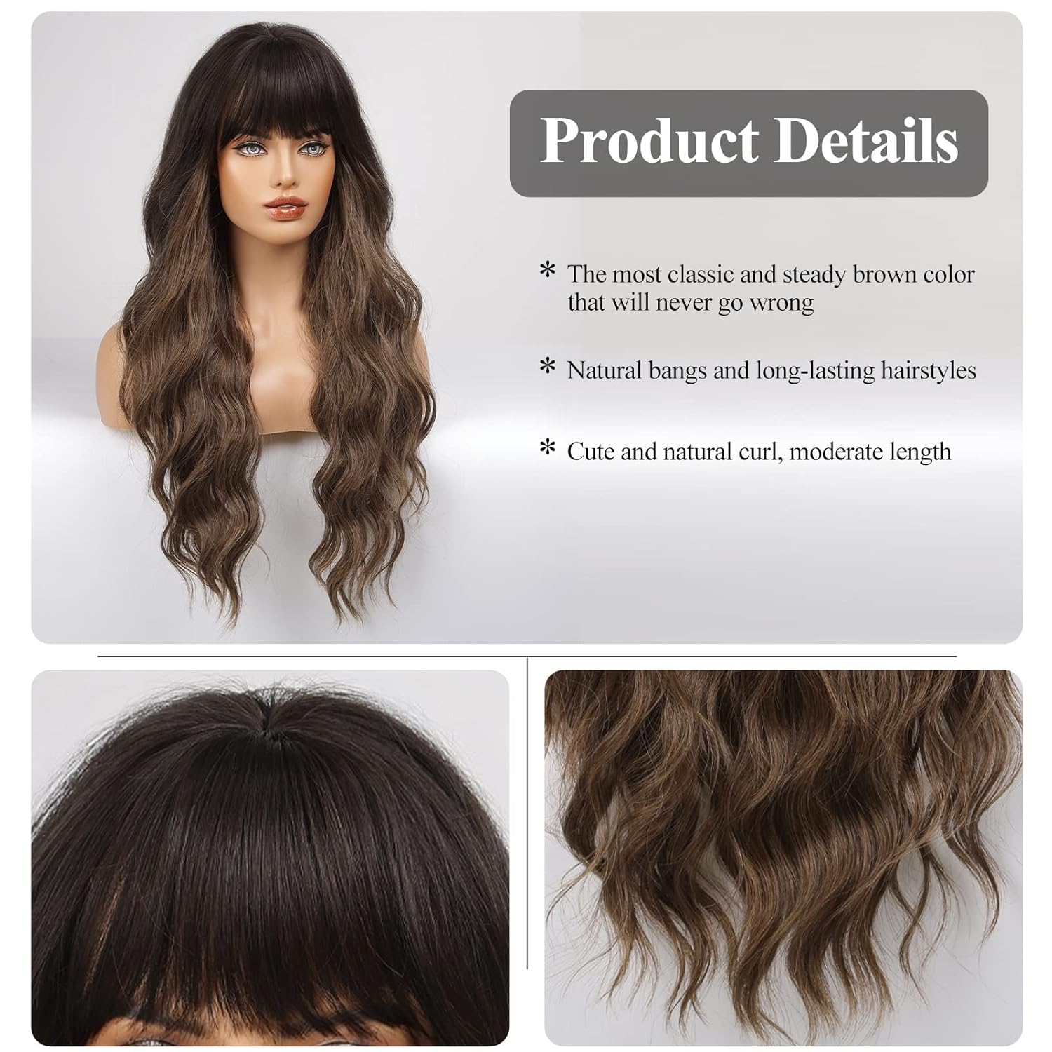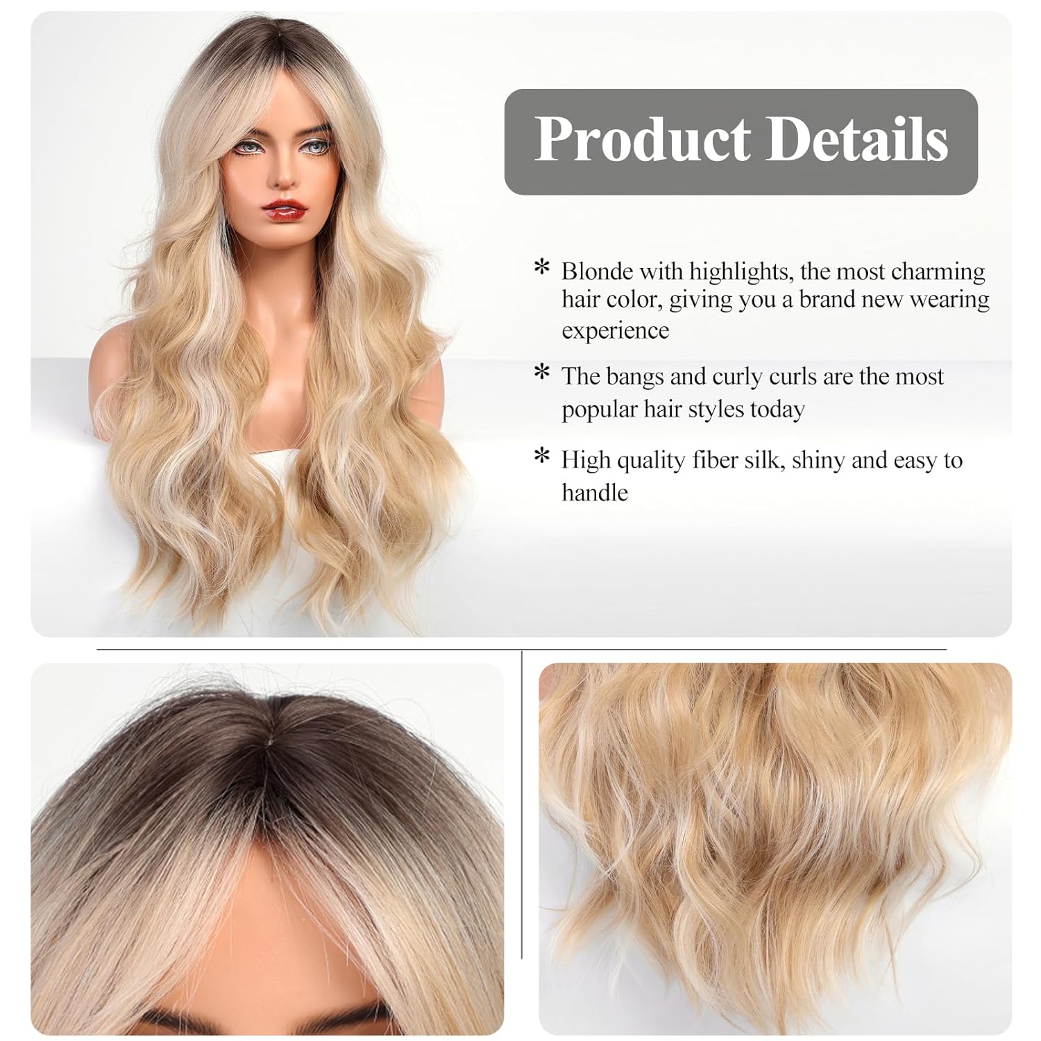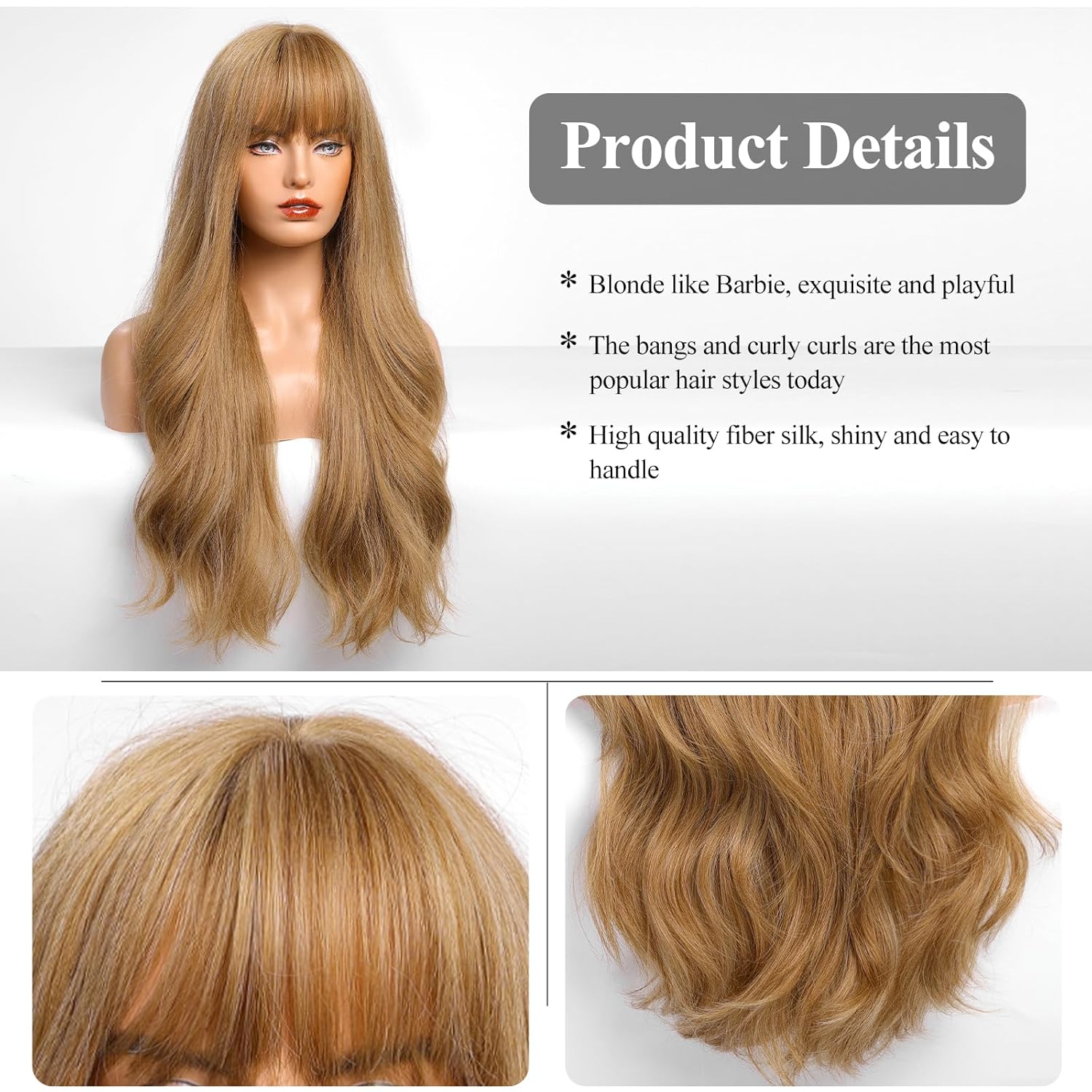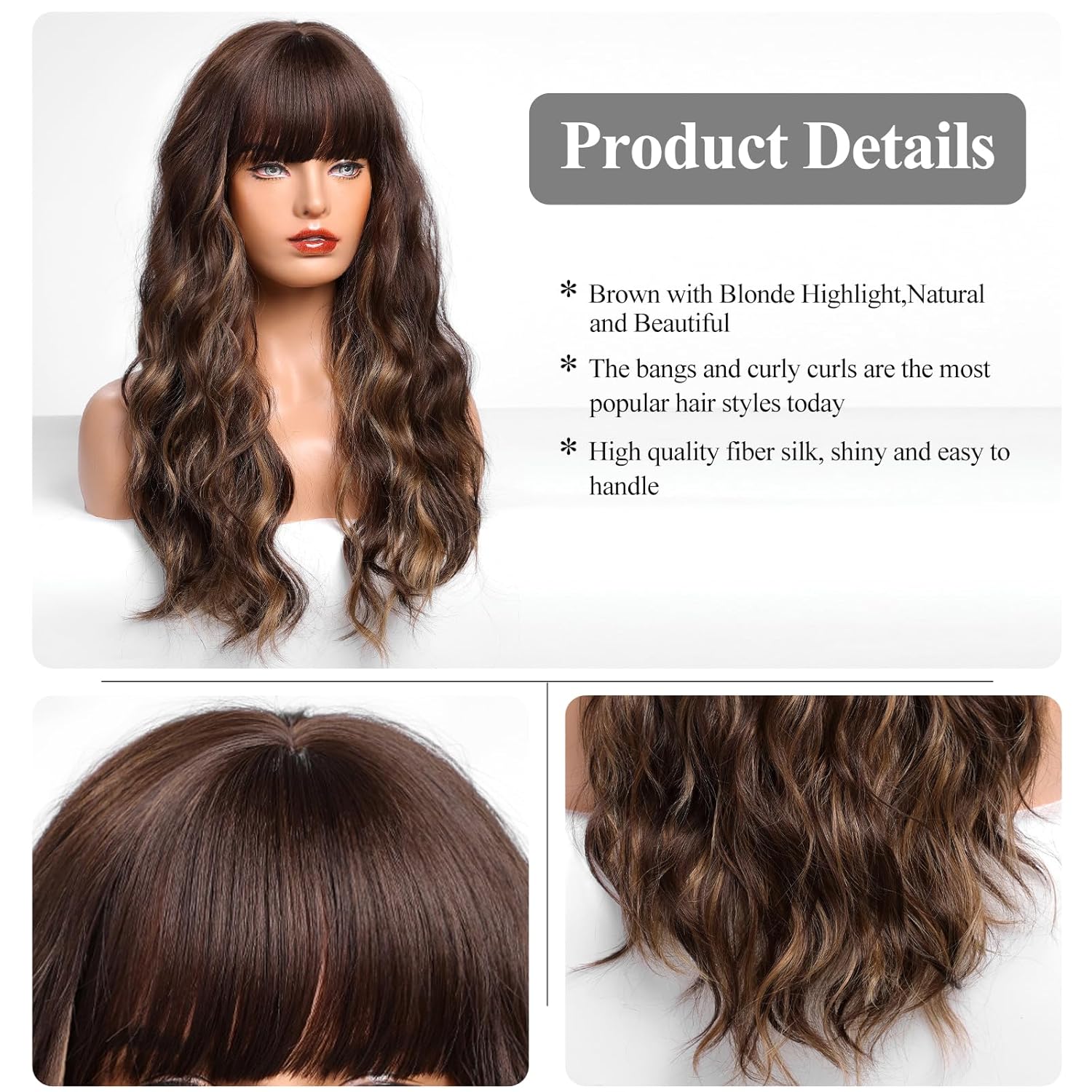 • 【Hair Material】Long Curly hair is made of high-quality heat-resistant synthetic fiber. The magic of this wig is that, through the improvement of traditional technology, natural bangs are added to make your hair more natural, soft, without hurting the skin, and tasteless.