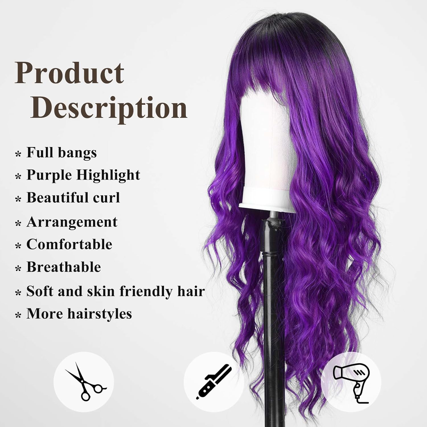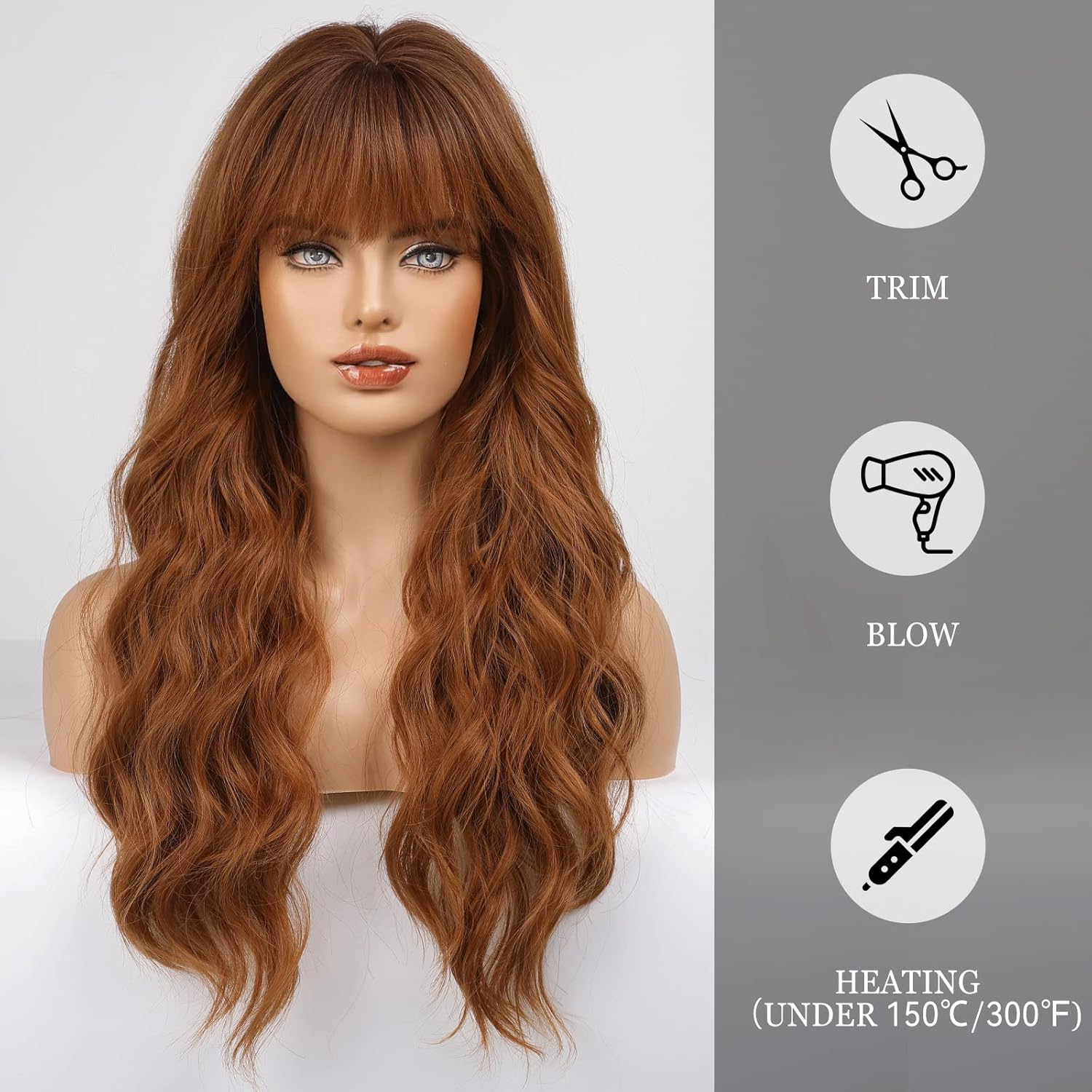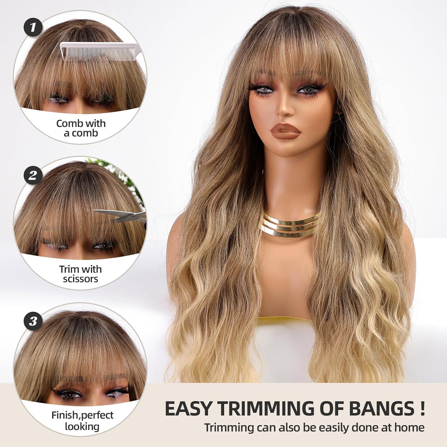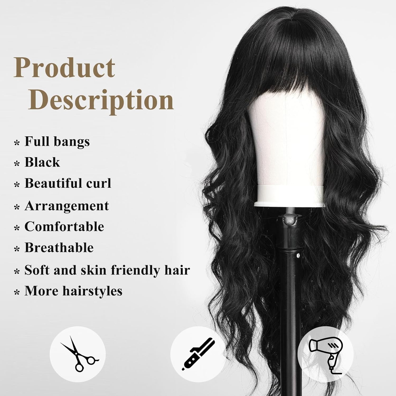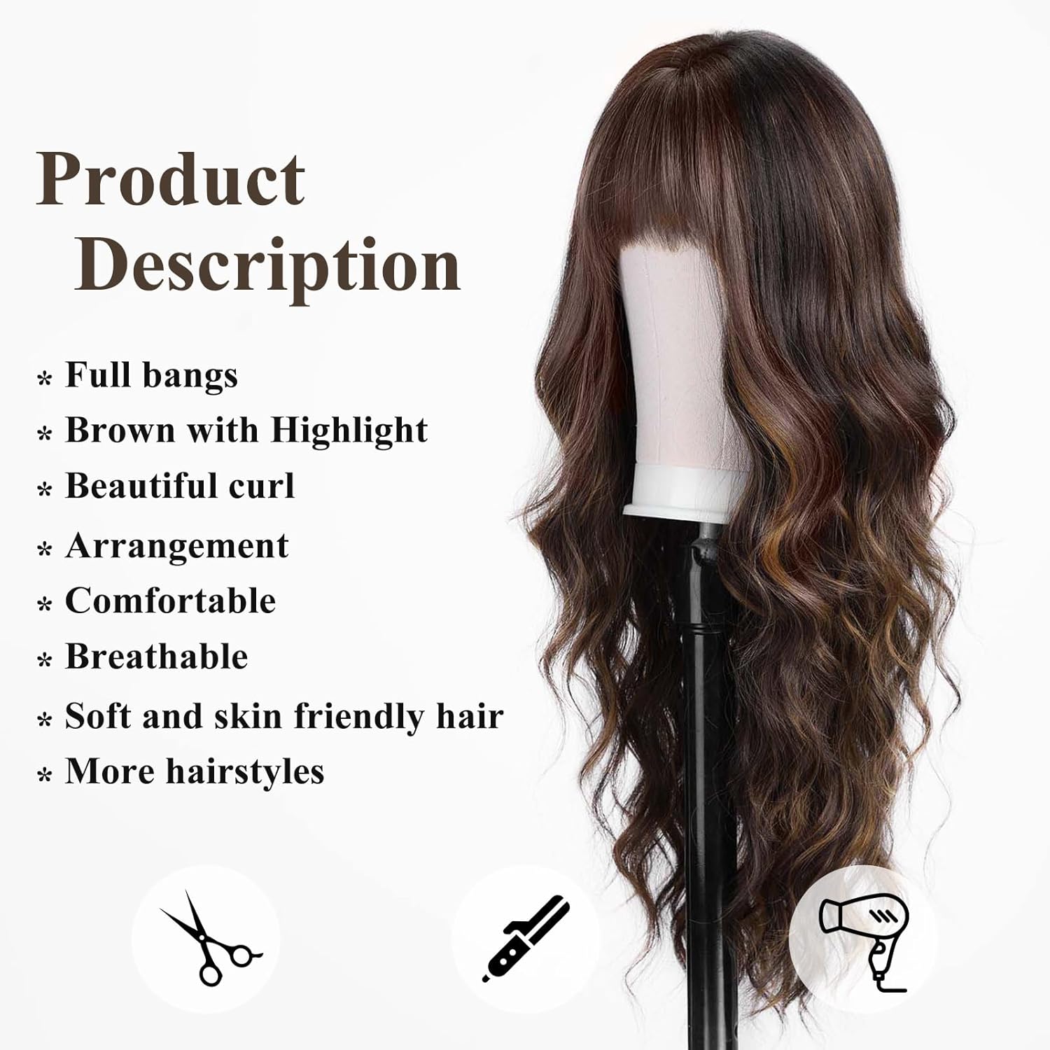 • 【Hair Material】Long Curly hair is made of high-quality heat-resistant synthetic fiber. The magic of this wig is that, through the improvement of traditional technology, natural bangs are added to make your hair more natural, soft, without hurting the skin, and tasteless.
