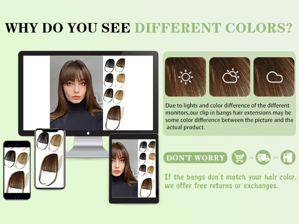 • Color Choice: Because the components of the Clip-In Bangs are handmade, each color sample or photo displayed may vary slightly on different screens and between production batches. If you have any questions, please feel free to contact us.COLOR DISPLAY