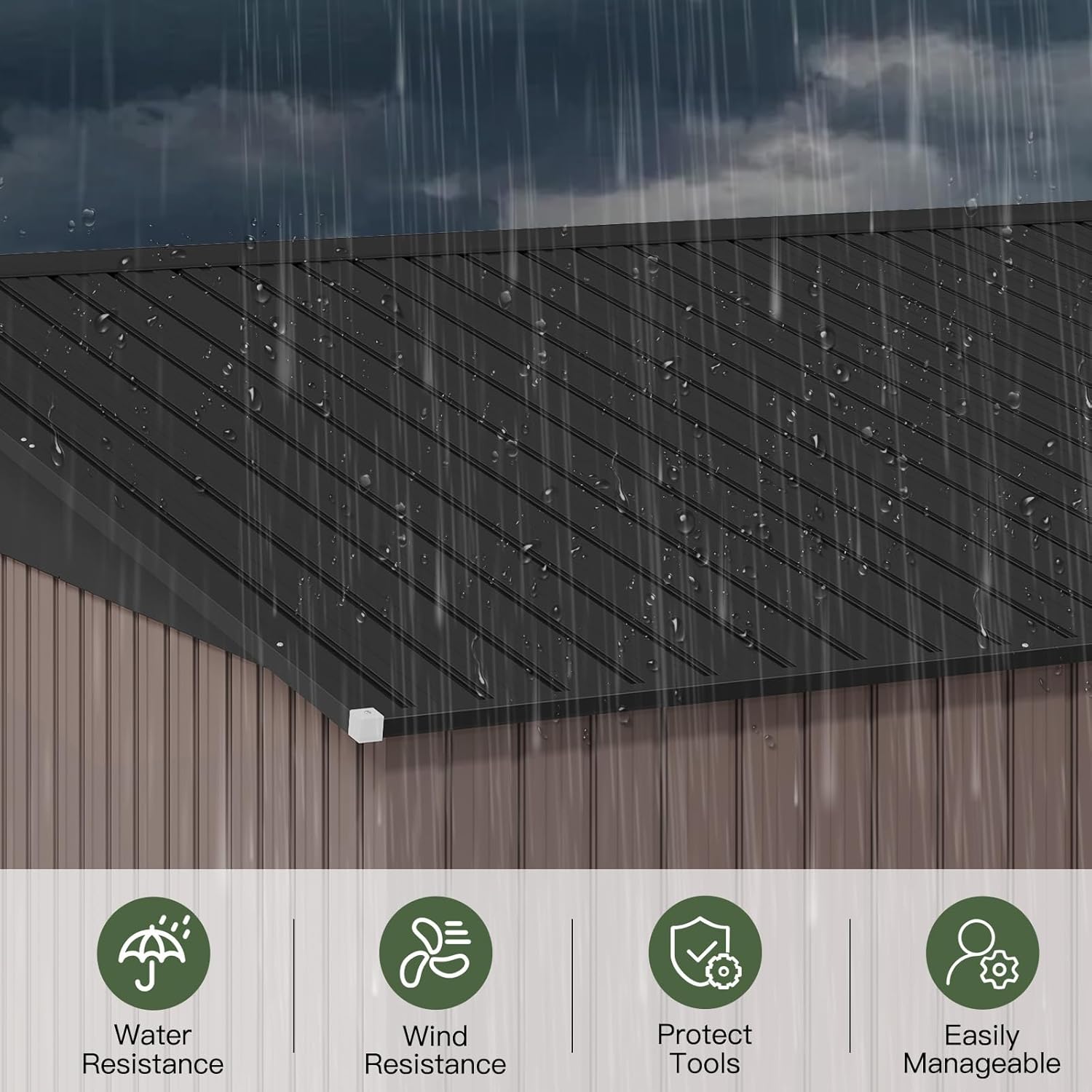 • Durable Large Shed: Galvanized steel, waterproof, withstands harsh weather for long life. Thick metal roof & walls ensure that it will not deform for a long time use. All structures have undergone rigorous structural engineering design, even in heavy snow and wind weather, it can be leisurely