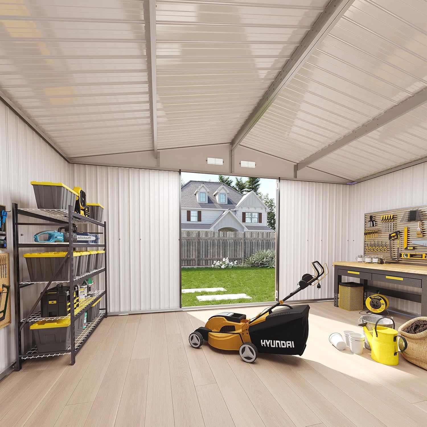 • Multiple Storage Modes: The Outdoor storage shed, measuring 12x10 FT, offers ample space(Internal capacity up to 560CU.FT) for all your outdoor storage requirements. This durable metal garden shed is applicable for storaging accommodate snow blowers, shovels, outdoor chairs, bicycles, and toy cars.Additionally, you can consider purchasing storage racks to optimize the organization of items such as shovels, umbrellas, antennas, escalators and more on this versatile outdoor storage solution