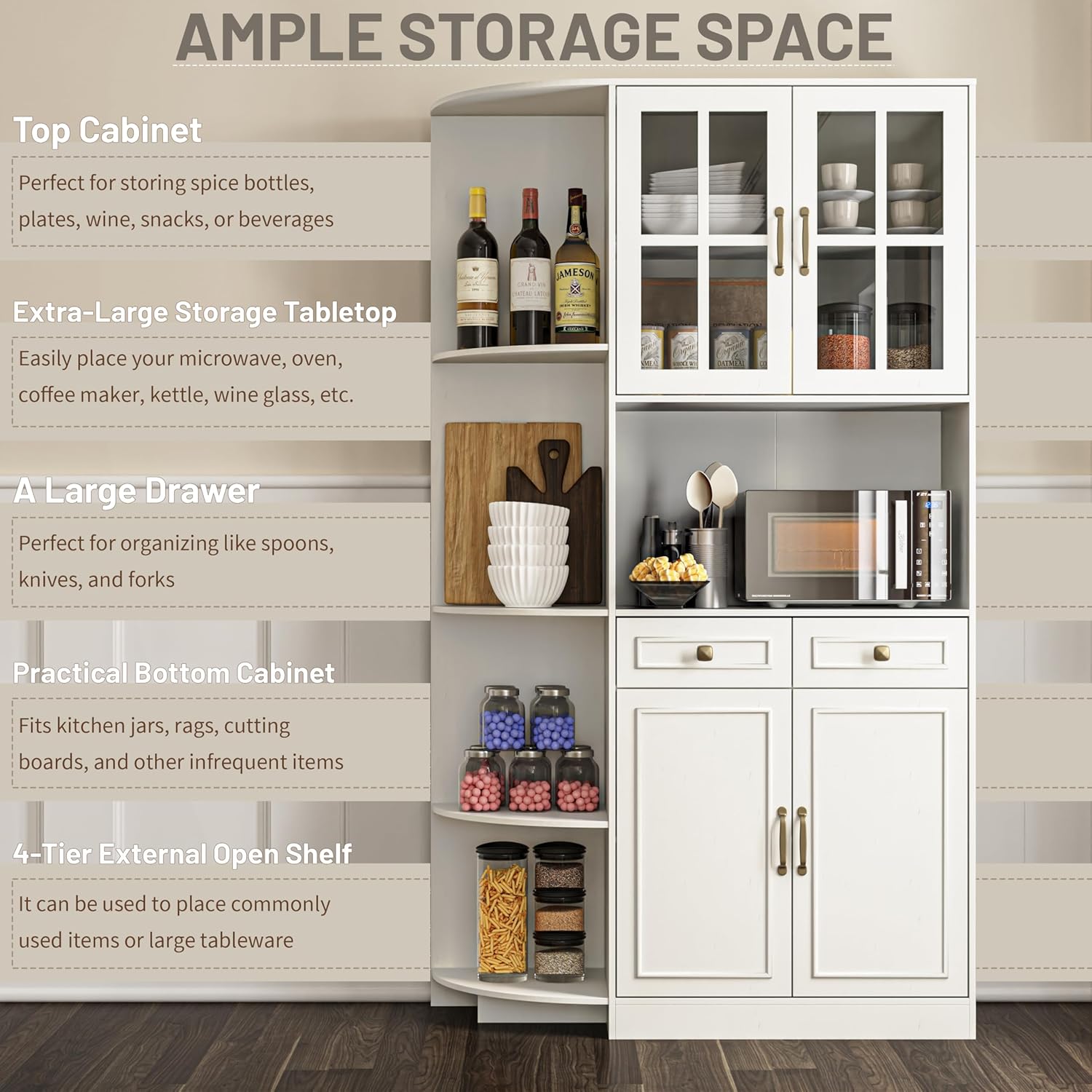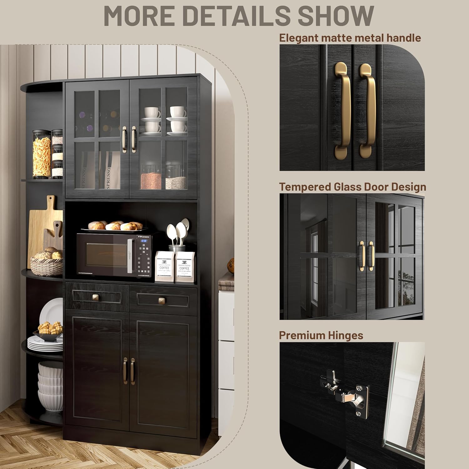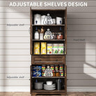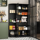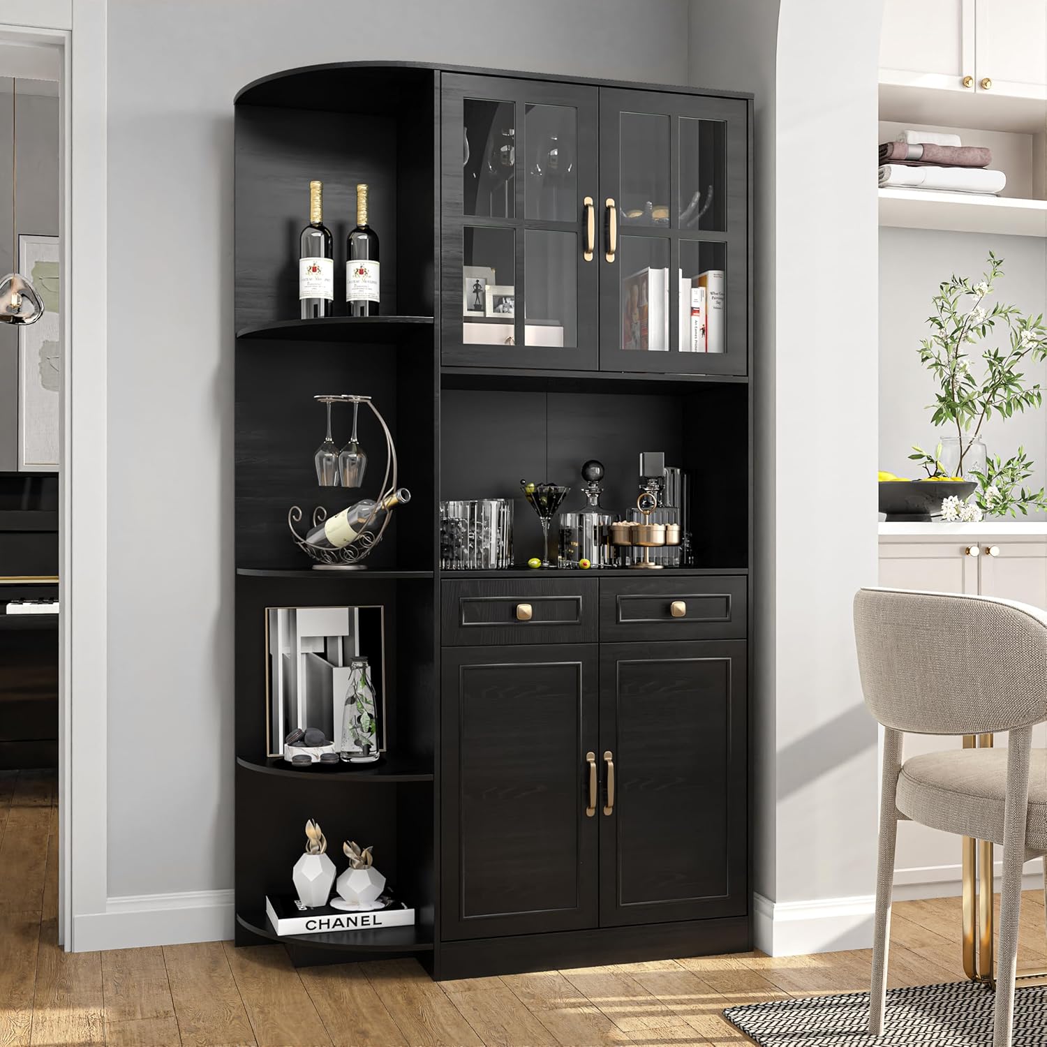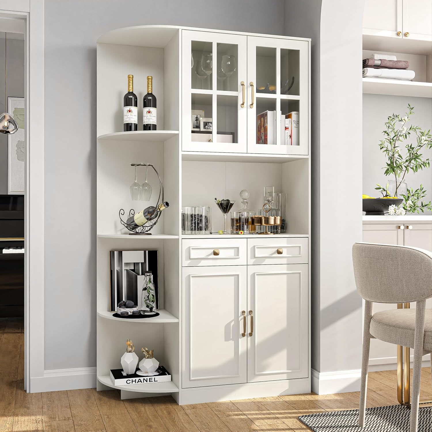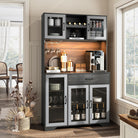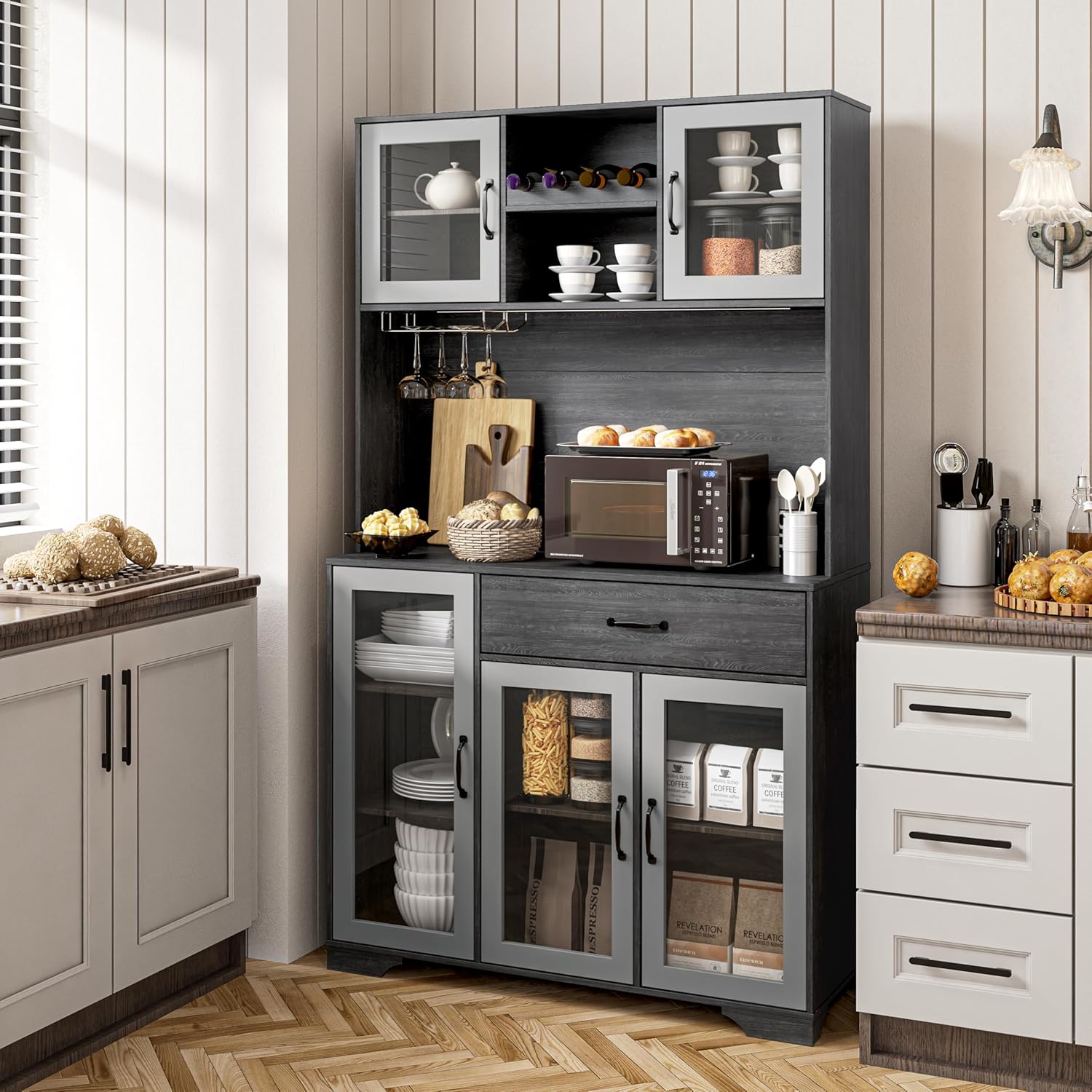 Transform your dining room or kitchen with a 71″ tall storage cabinet that functions as a coffee bar, liquor cabinet, or pantry — blending rustic charm with modern elegance.
